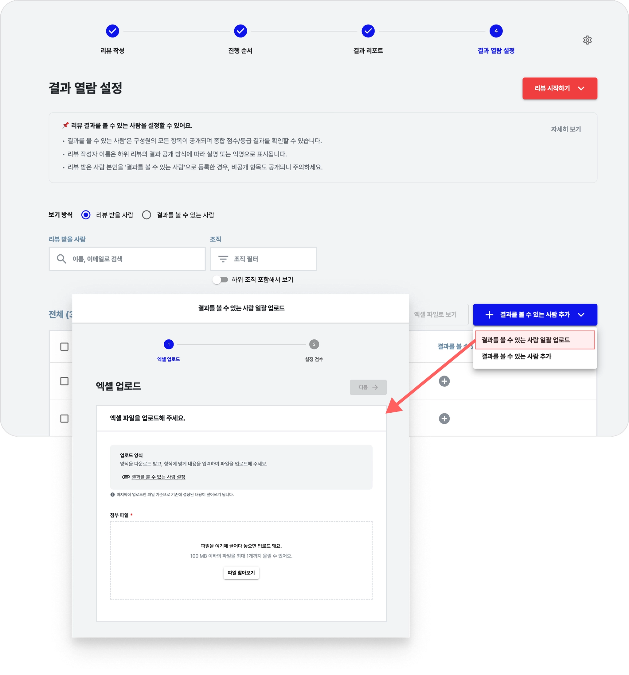 엑셀 업로드는 결과 열람자 설정 화면에서만 진행할 수 있습니다.