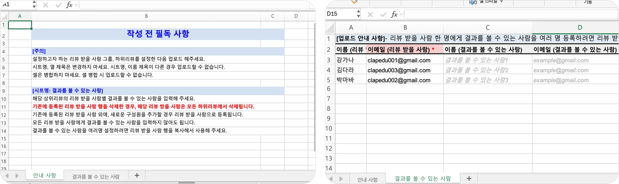 변경이 필요한 정보(결과를 볼 수 있는 사람 이름/이메일)를 엑셀에서 직접 수정해 주세요.