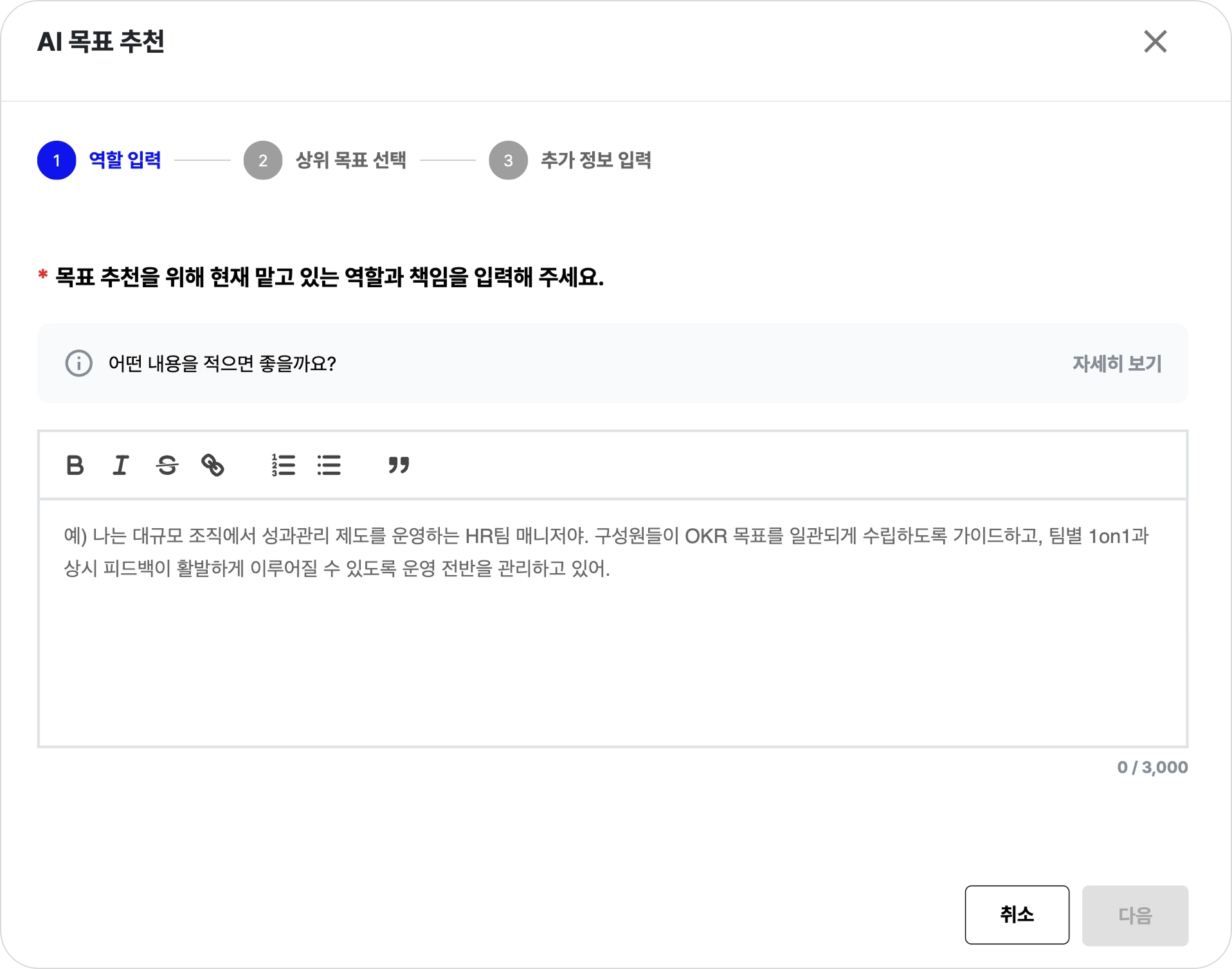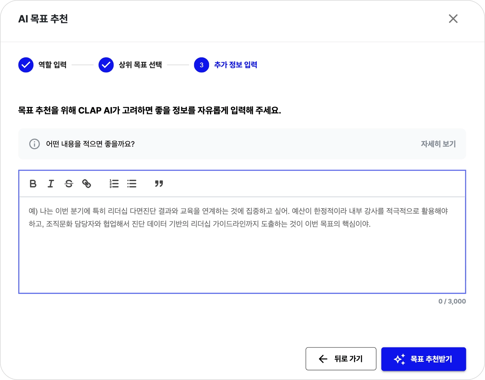 입력 내용을 구체적으로 작성할수록, AI가 더 적합한 목표를 추천합니다.