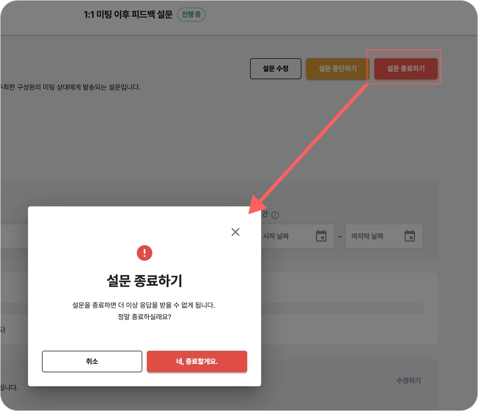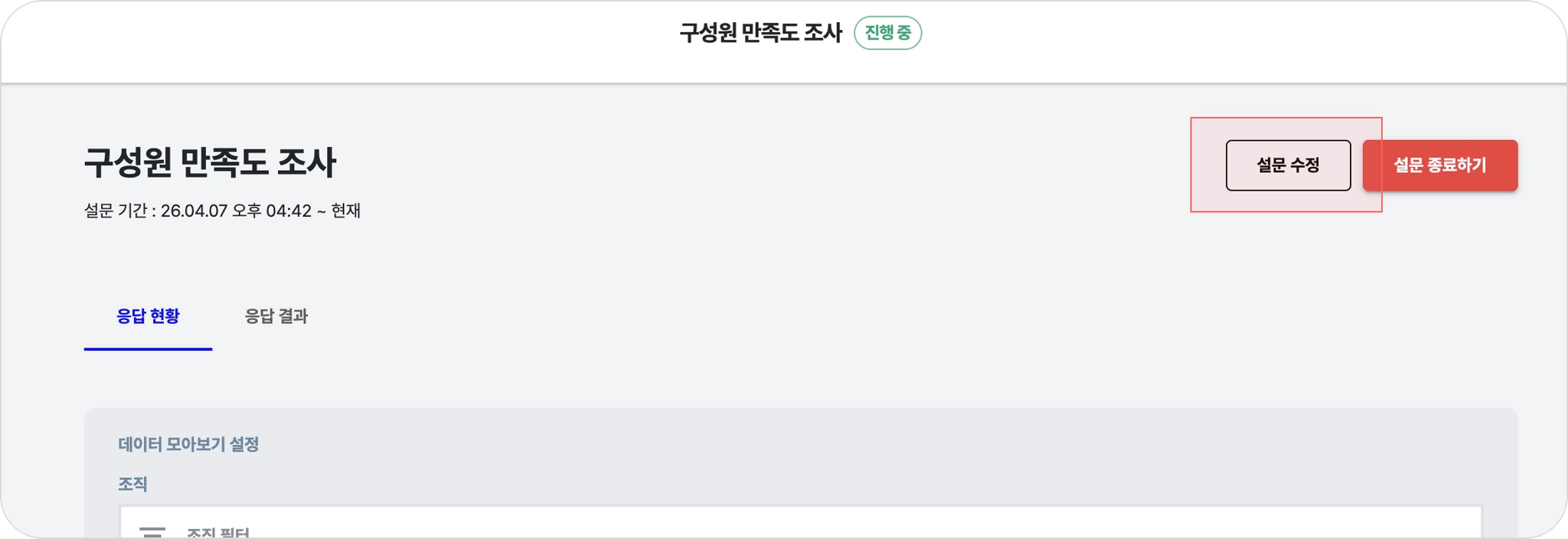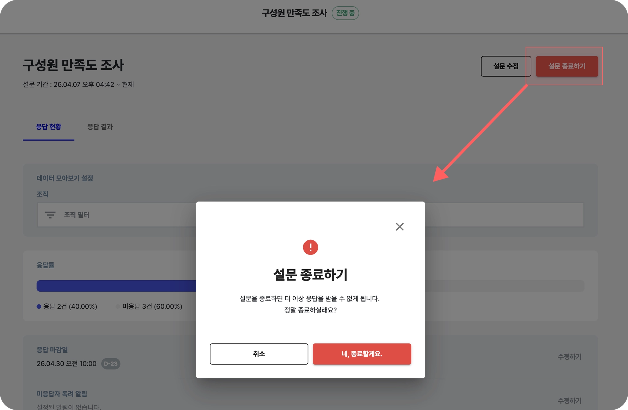 설문 응답 수집을 종료하려면, 설문 운영 화면에서 [설문 종료하기] 버튼을 클릭합니다.