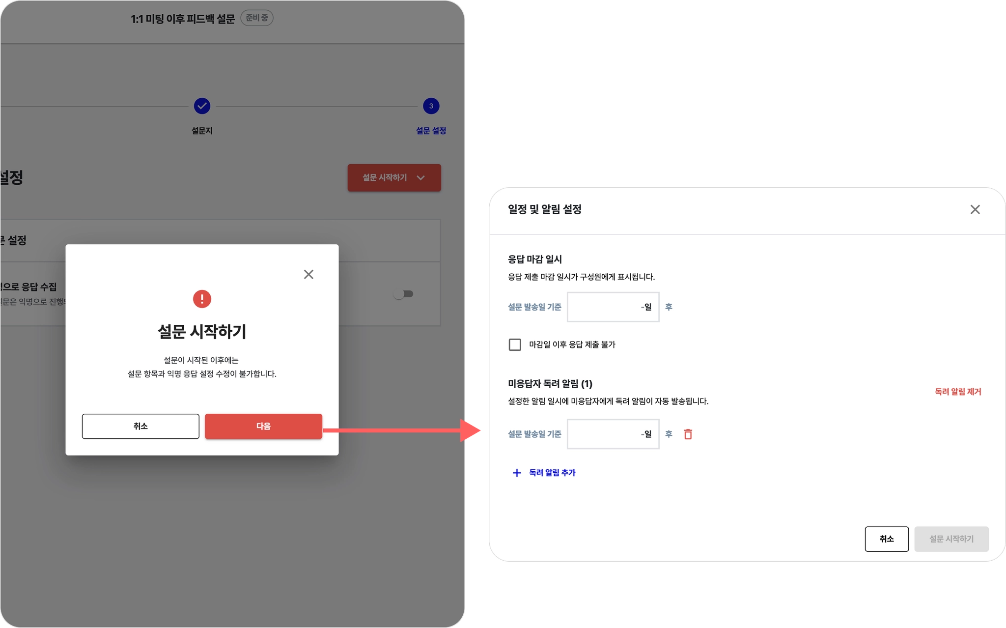 설문이 시작되면, 이후 진행되는 1:1 미팅 종료 시마다 자동으로 설문이 발송됩니다.