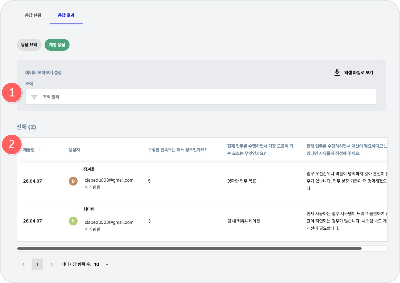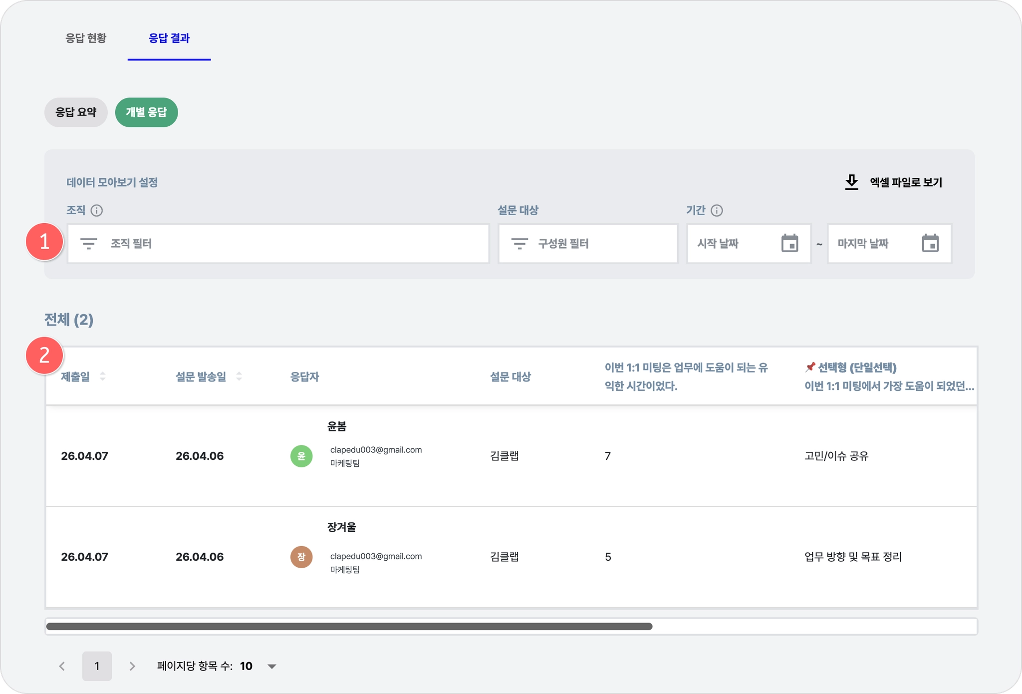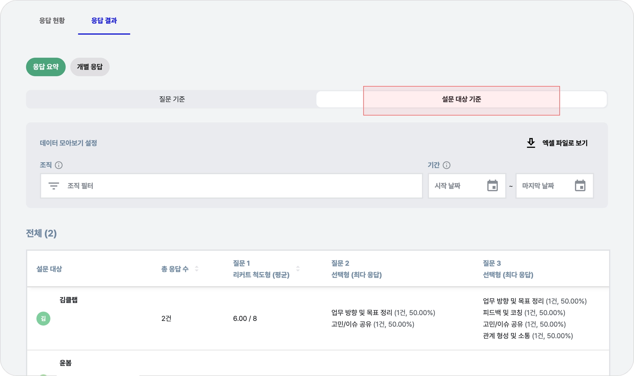조직, 기간 필터를 적용해 특정 조건의 응답 데이터를 확인할 수 있습니다.