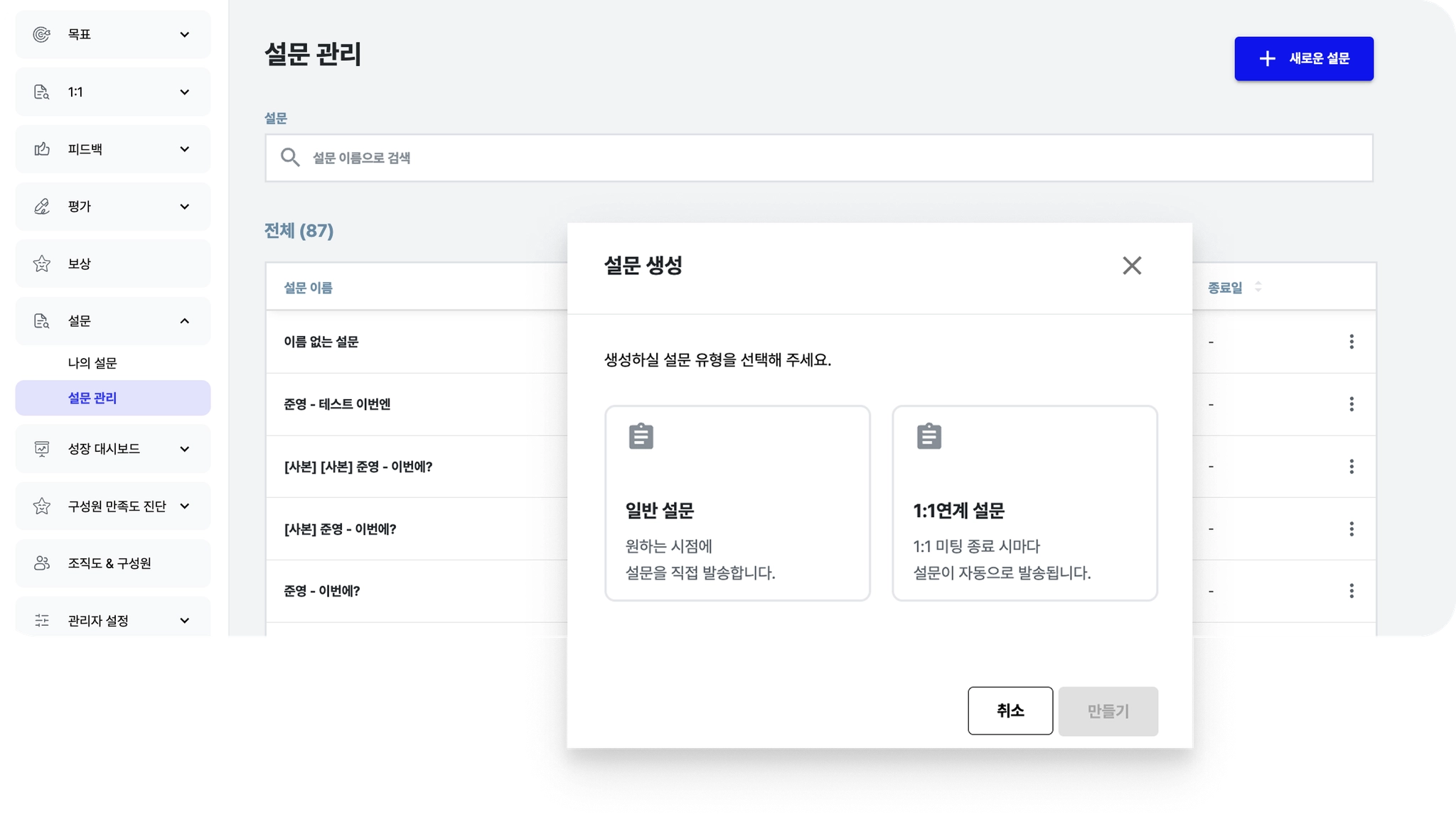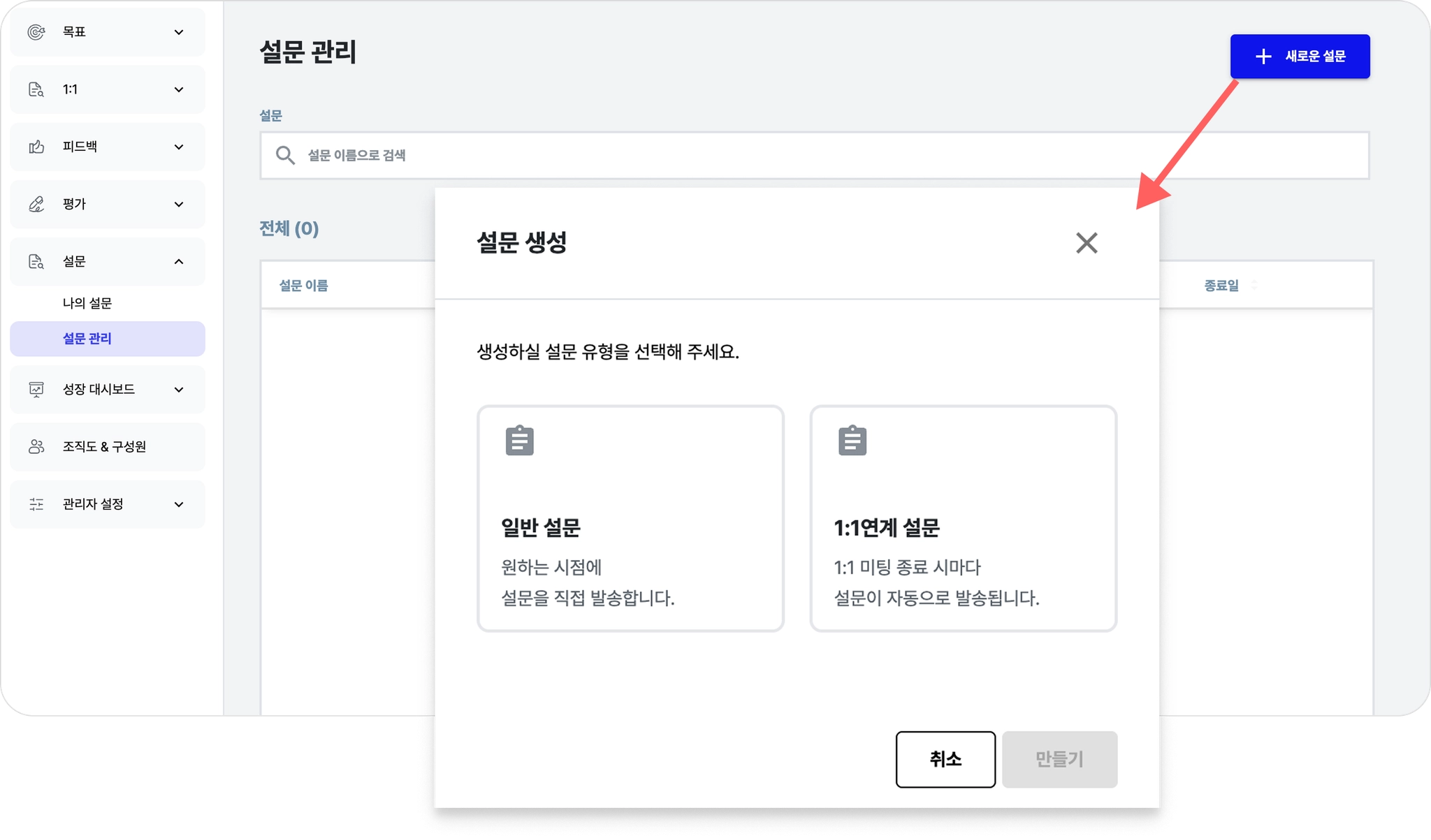 화면 경로 : 설문 → 설문 관리 → [+새로운 설문] → [1:1 연계 설문] → [만들기] 버튼을 클릭합니다.
