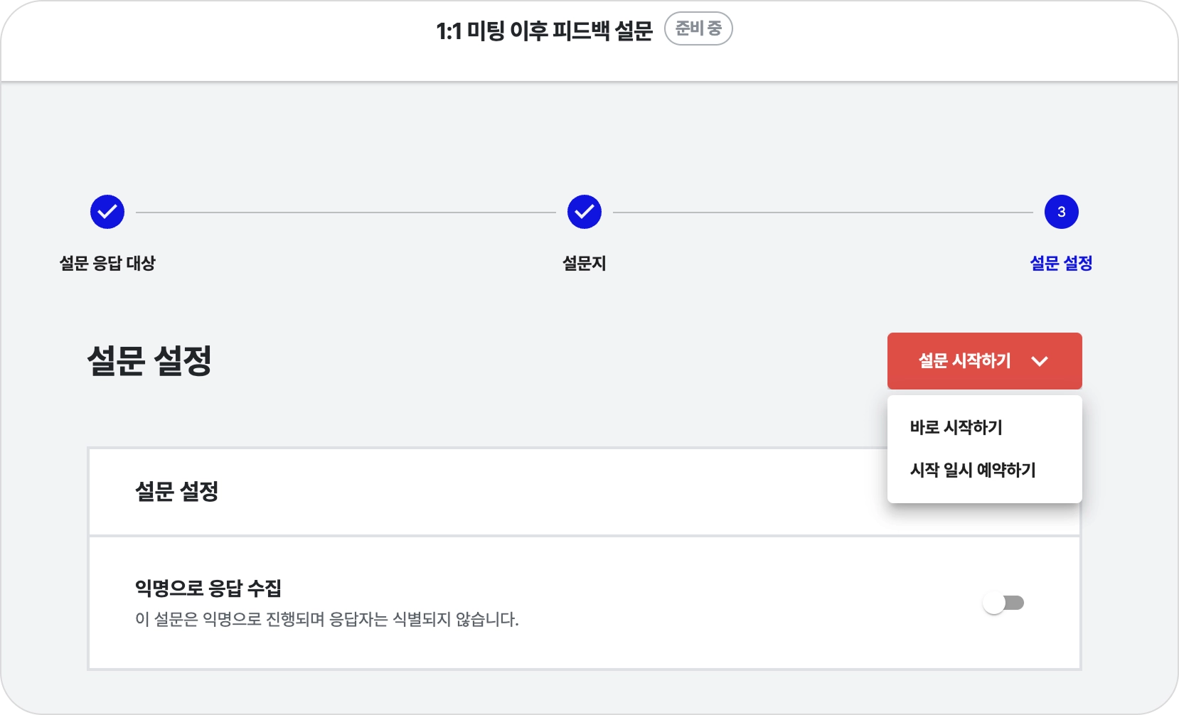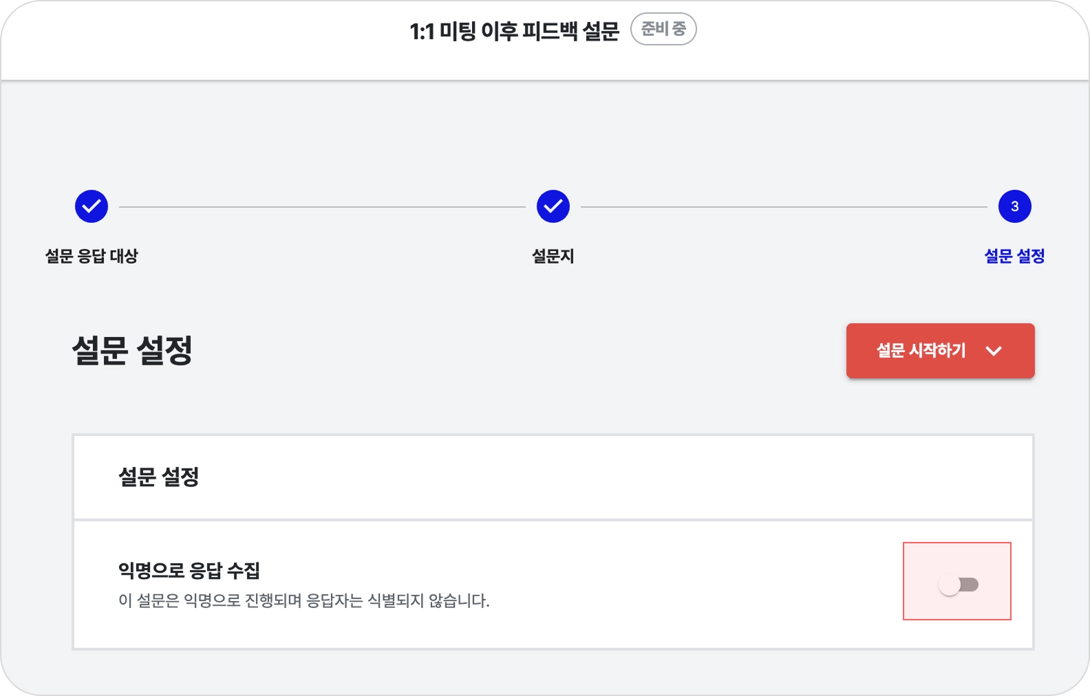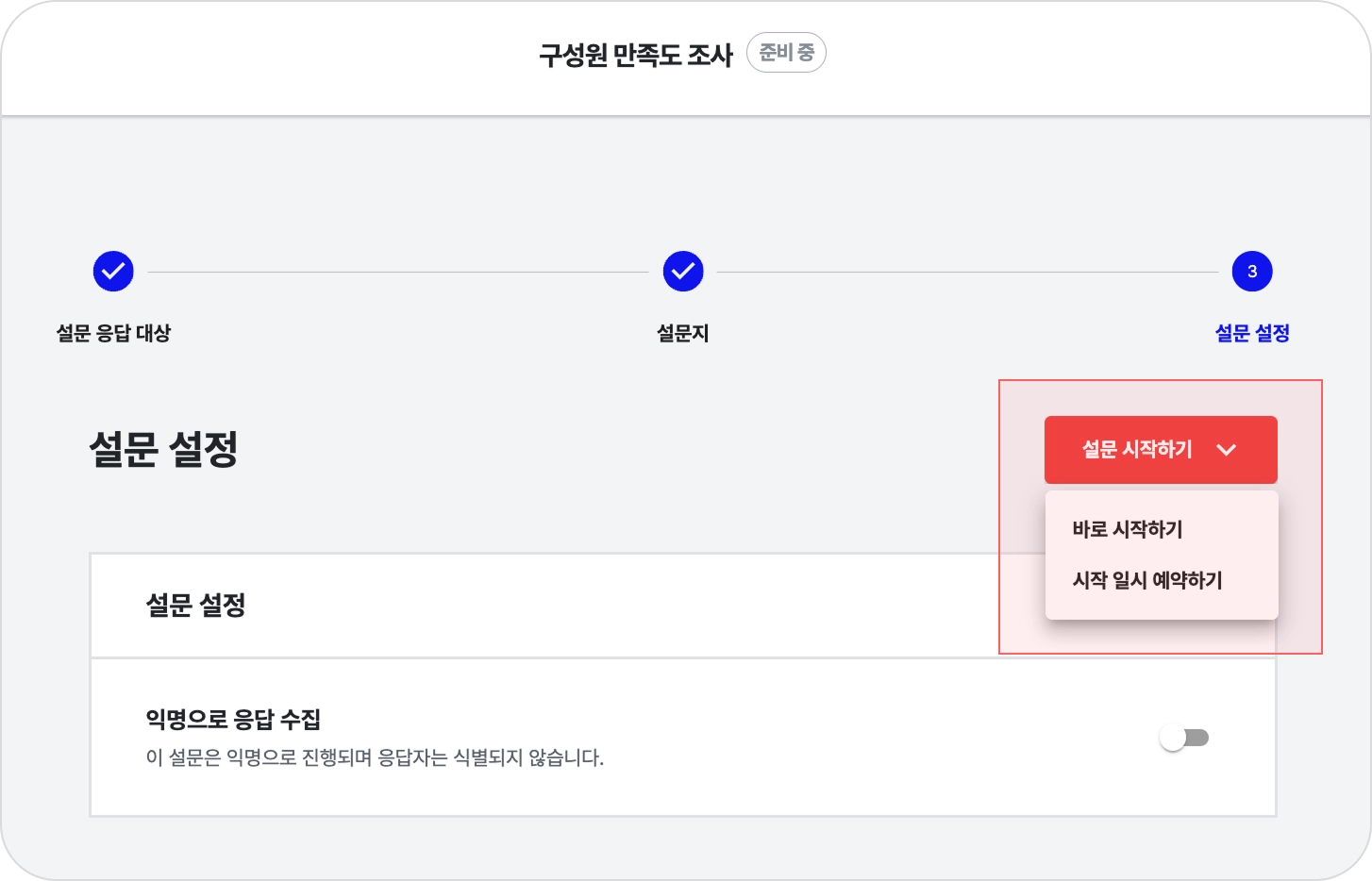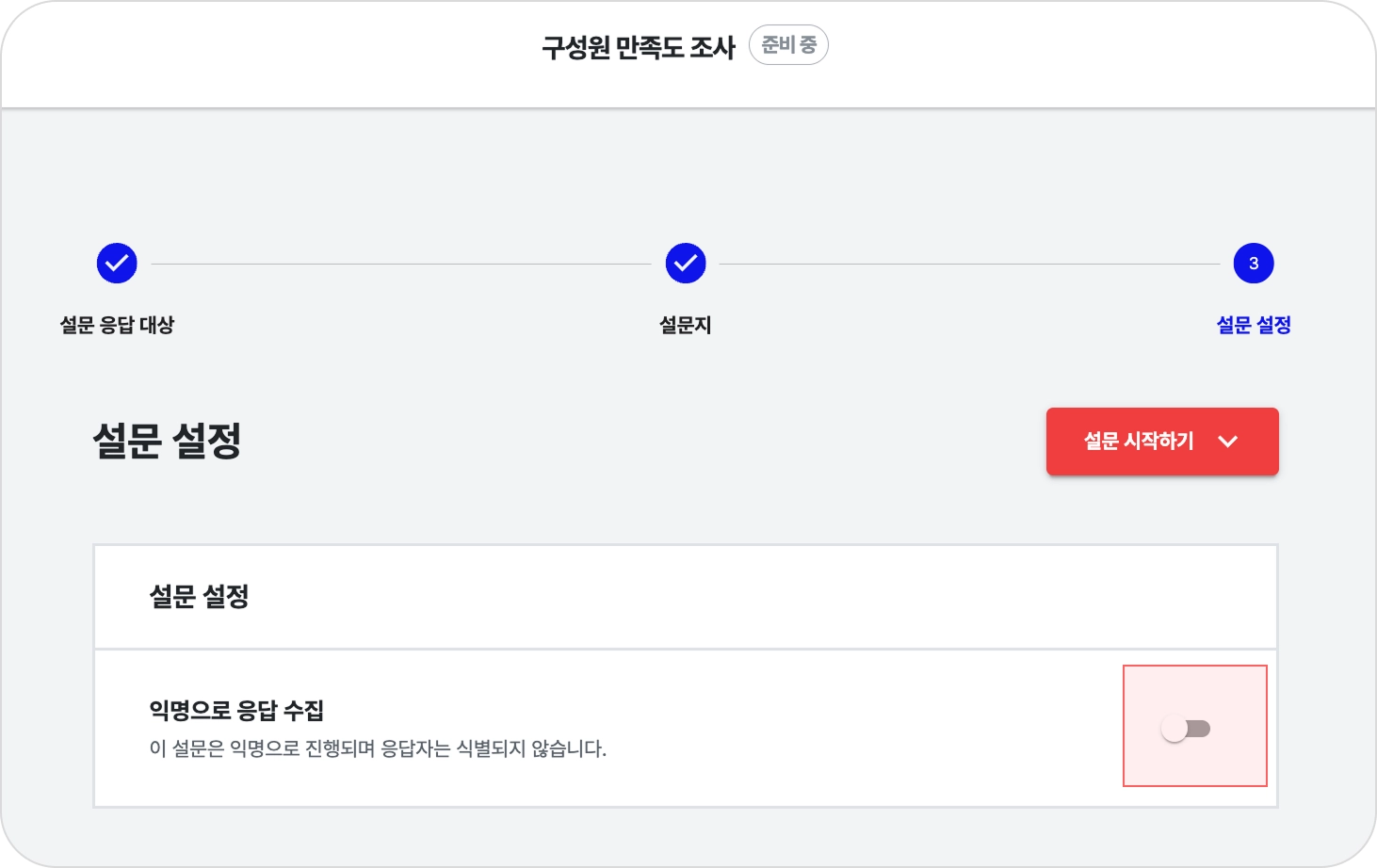 설문 설정을 완료한 뒤, [설문 시작하기] 버튼을 클릭합니다.