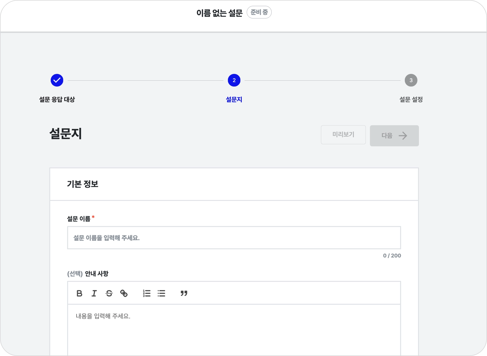 설문지: 설문 이름과 안내 사항을 수정할 수 있습니다.