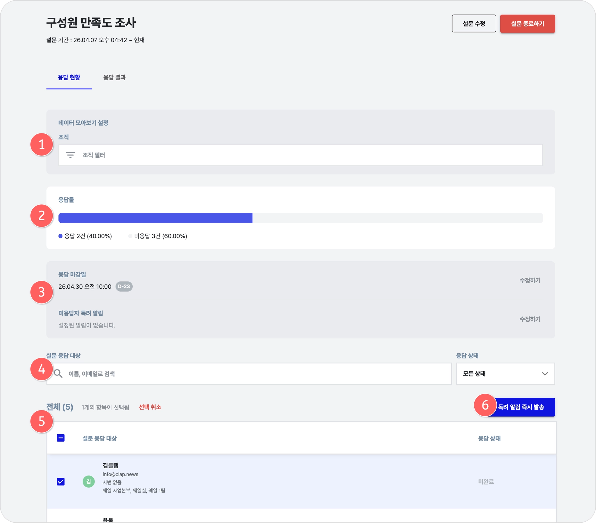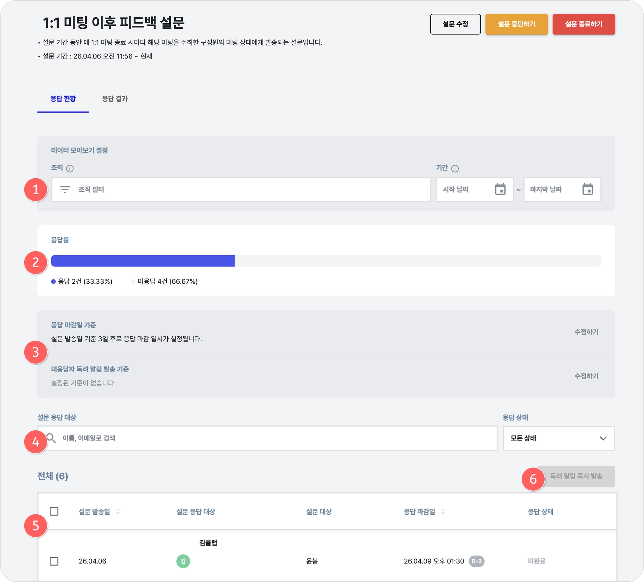 설문 응답 진행 상태를 확인하고, 미응답자를 관리할 수 있습니다.