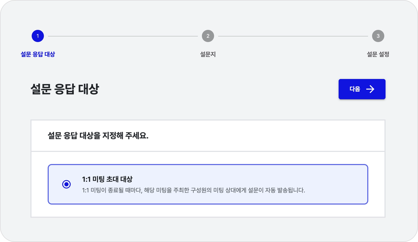 설문은 워크스페이스에서 진행된 모든 1:1 미팅에 공통 적용되며, 미팅 종료 후 동일한 설문이 발송됩니다.