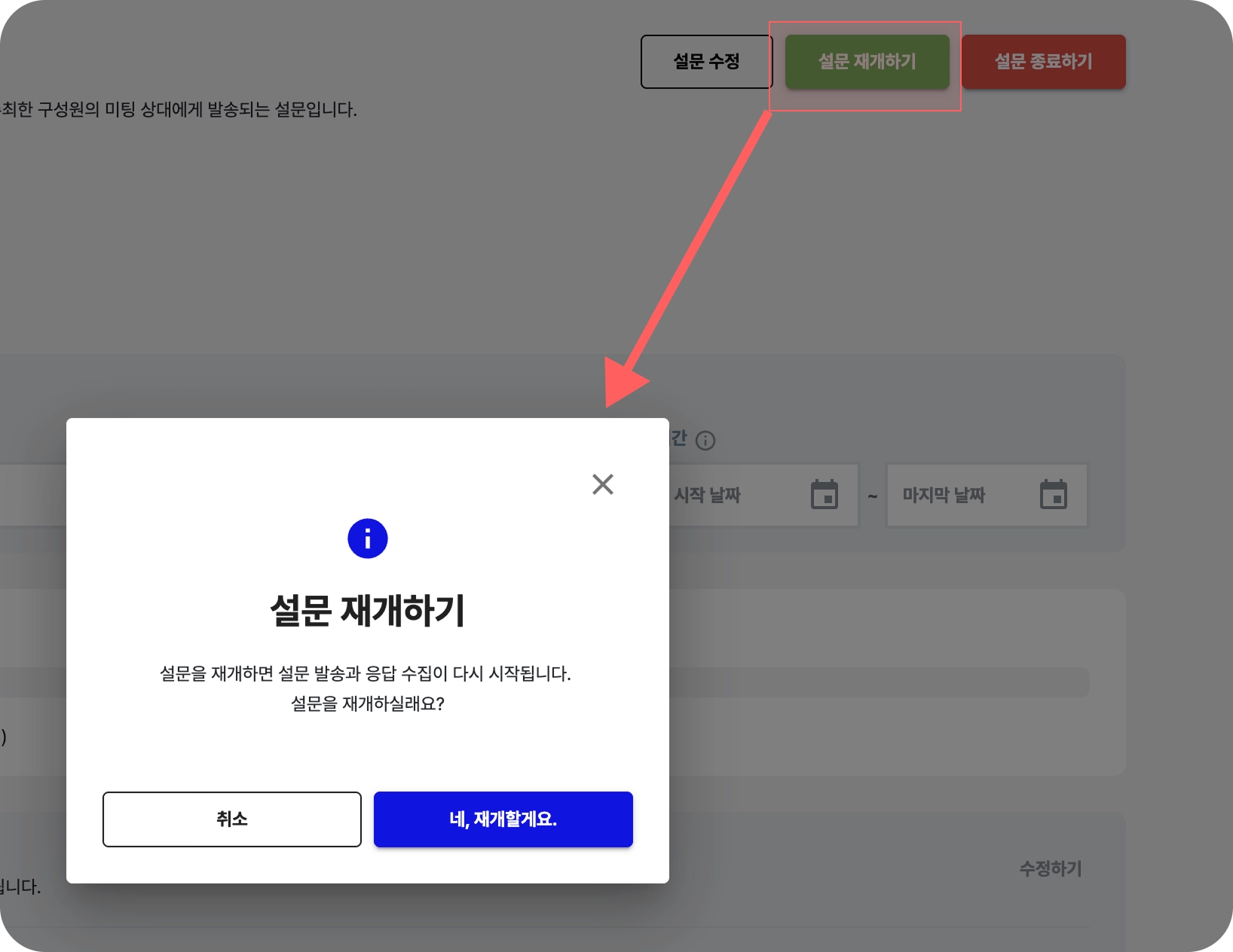 [설문 재개하기] 버튼을 클릭하면 설문 발송이 다시 시작됩니다.