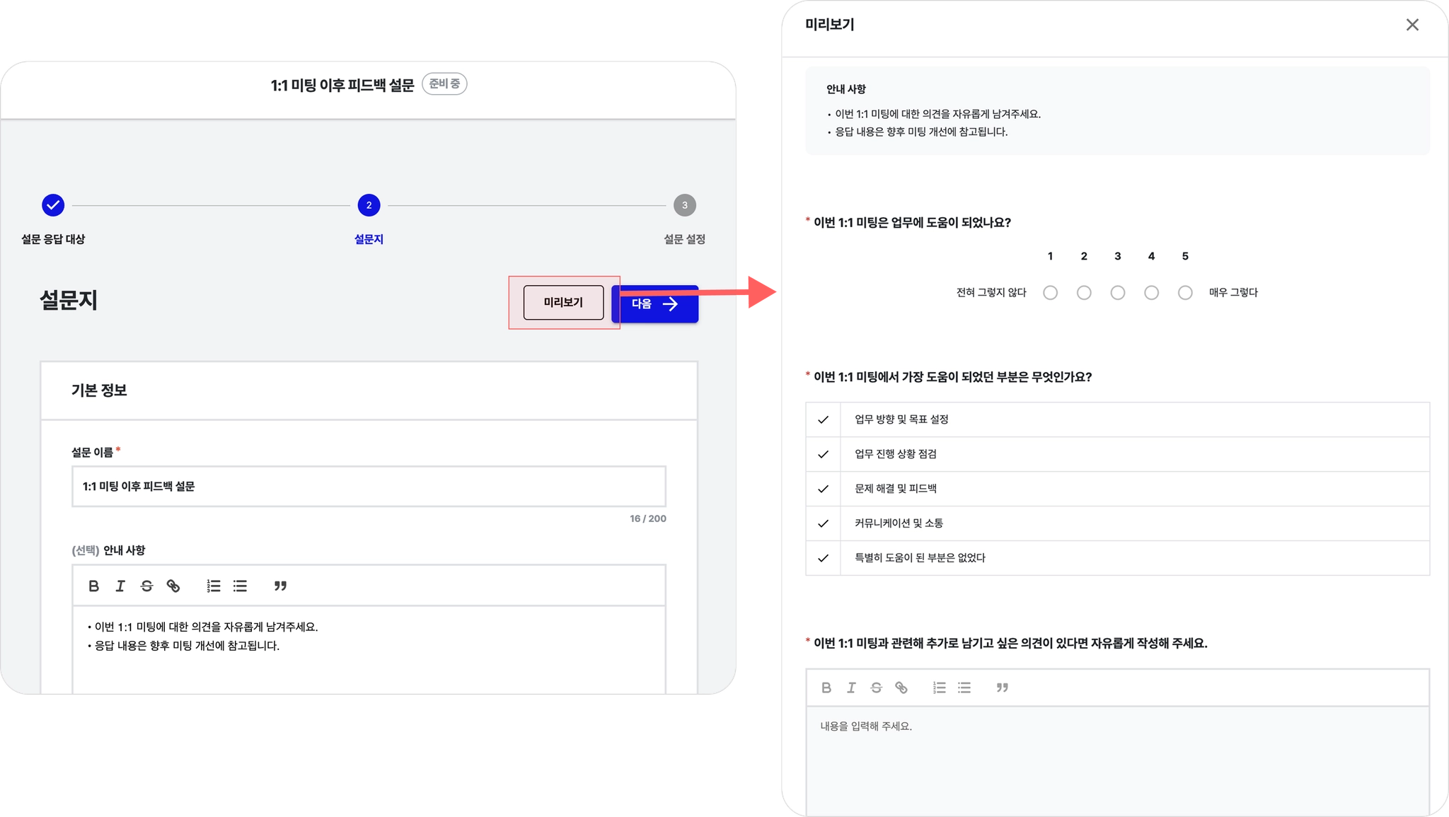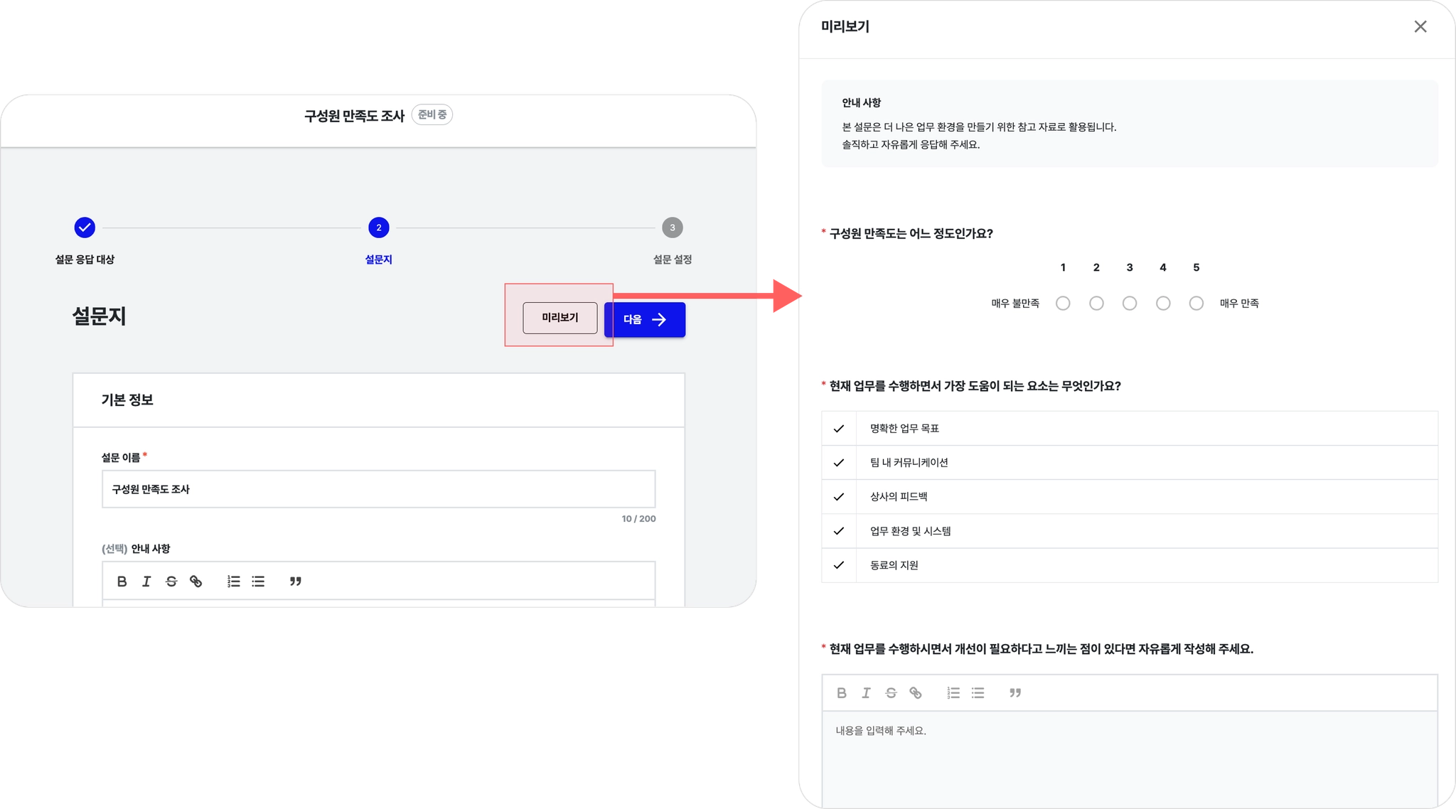 화면 우측 상단 [미리보기]를 눌러 구성원에게 실제로 보이는 설문 화면을 확인할 수 있습니다.