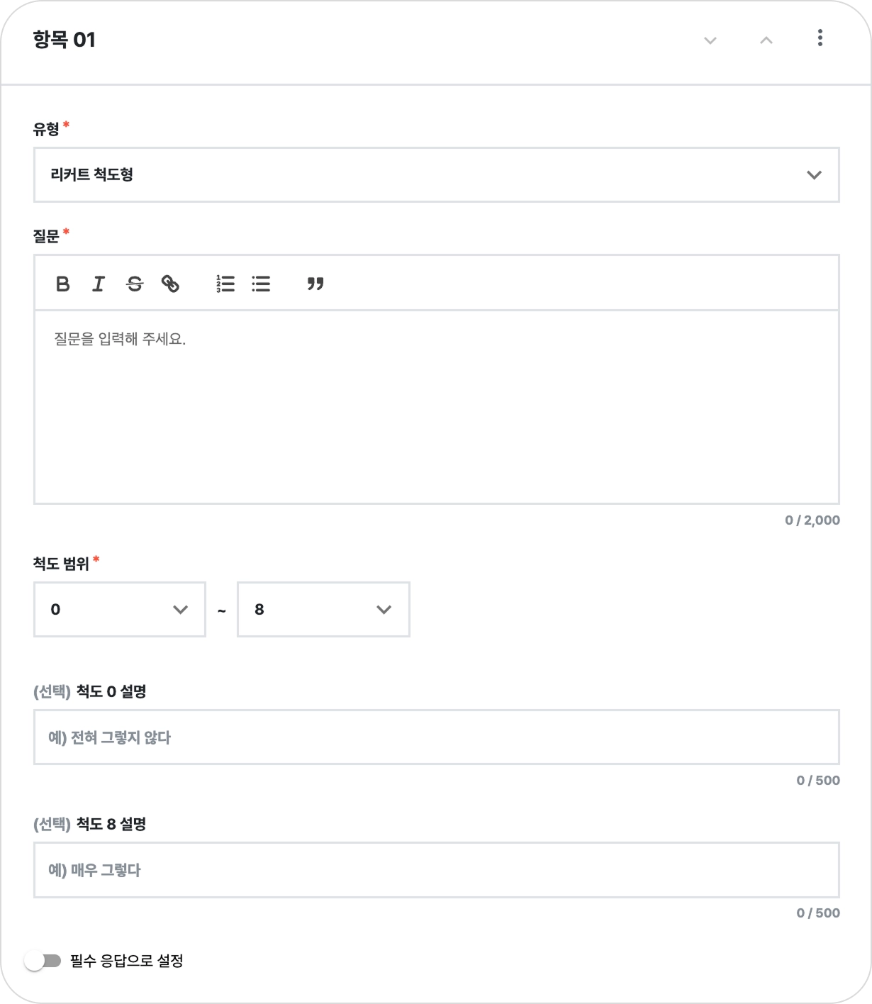 최소값과 최대값에 각각 설명을 입력할 수 있습니다. (예: 1 = 매우 불만족, 5 = 매우 만족)
