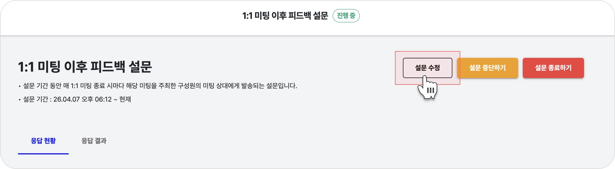 설문 운영 화면에서 [설문 수정] 버튼을 클릭해 설정을 변경할 수 있습니다.