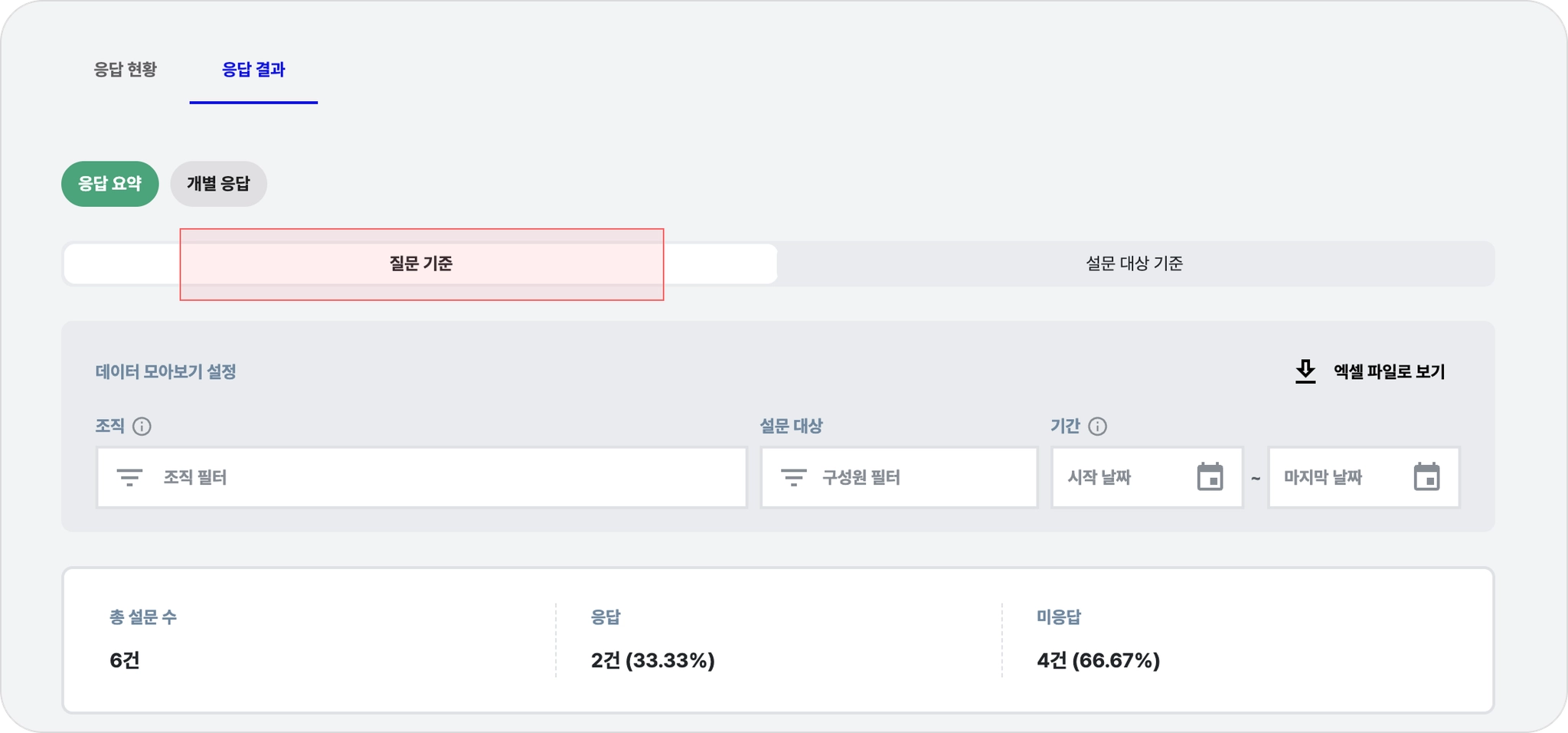 응답 요약은 질문 기준 / 설문 대상 기준으로 나누어 확인할 수 있습니다.