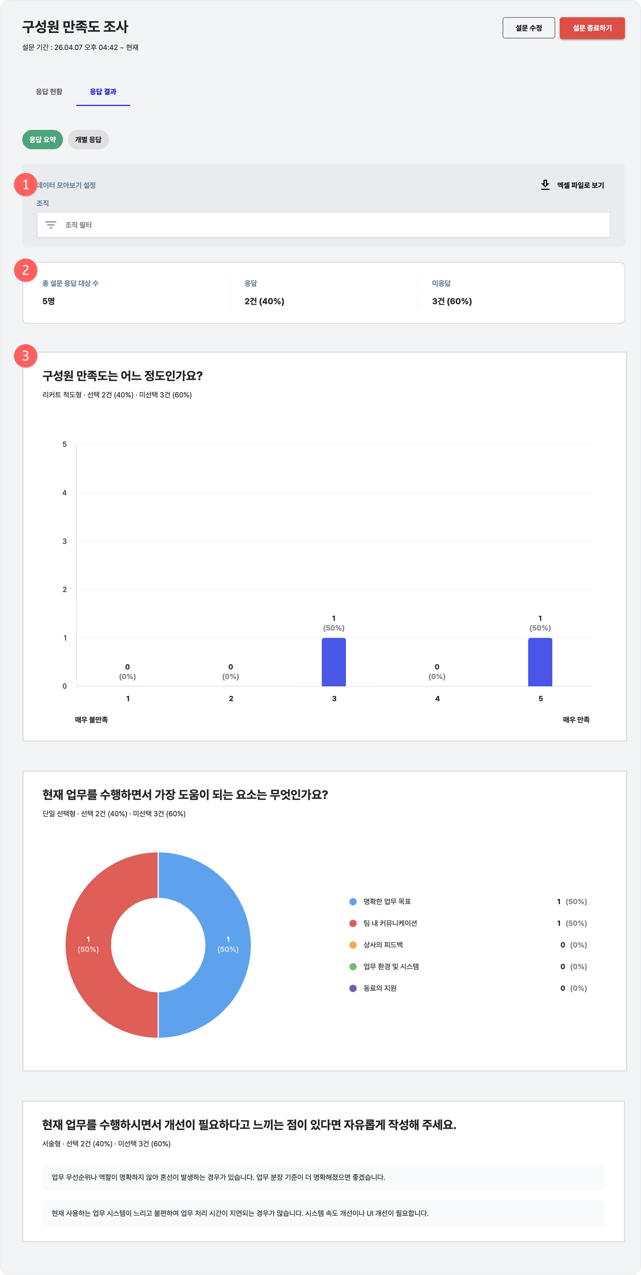 (3) 그래프 : 질문 유형에 따라 응답 결과가 그래프로 시각화됩니다.