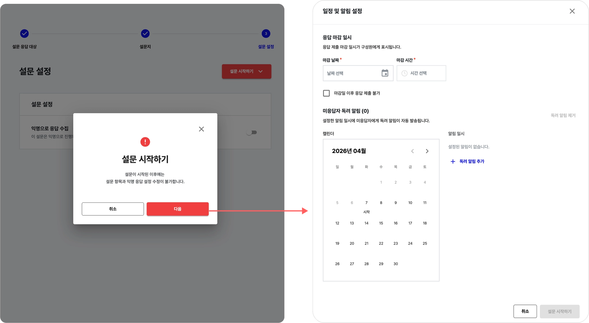 시작 일시 예약하기: 지정한 날짜와 시간에 설문이 자동으로 시작됩니다.