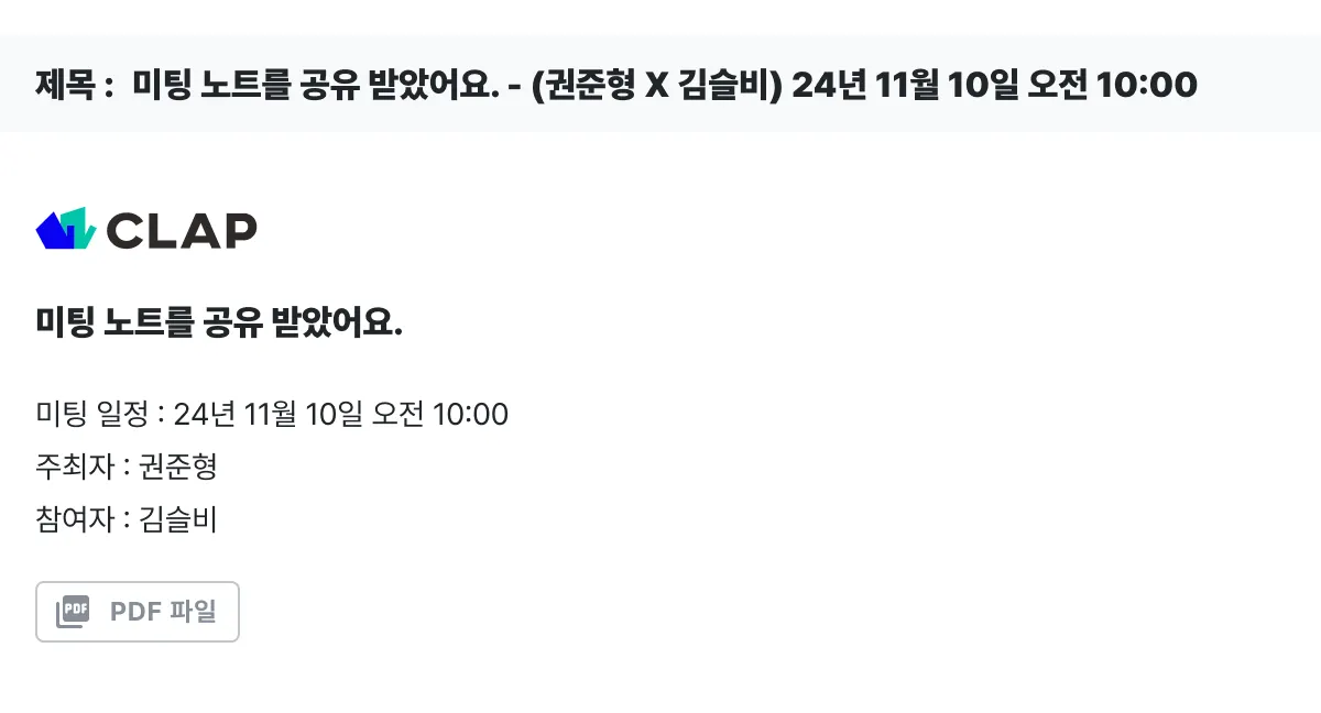 공유 대상자는 이메일 알림을 받고 ‘PDF 파일’로 미팅노트를 확인할 수 있습니다.