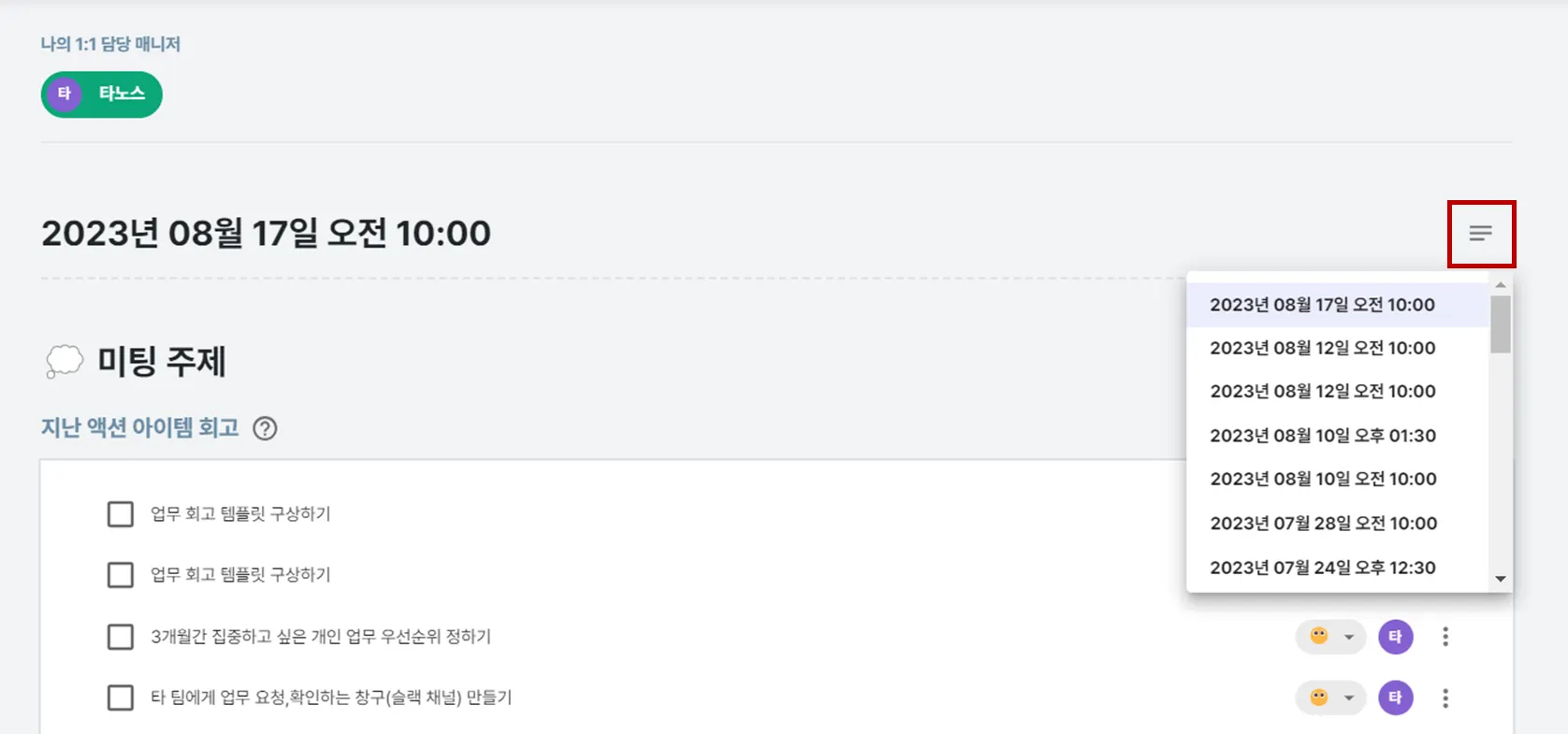 나의 1:1 > 상단 오른쪽 ≡ 버튼 > 미팅 날짜를 클릭하면 해당 일자의 미팅 노트를 볼 수 있습니다.