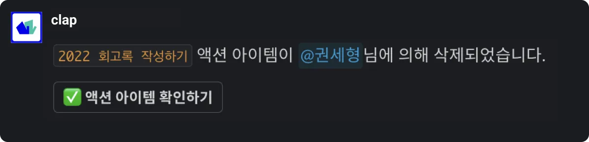 액션 아이템 담당자가 아닌 사람이 삭제하면 담당자에게 슬랙/이메일 알림이 발송돼요.