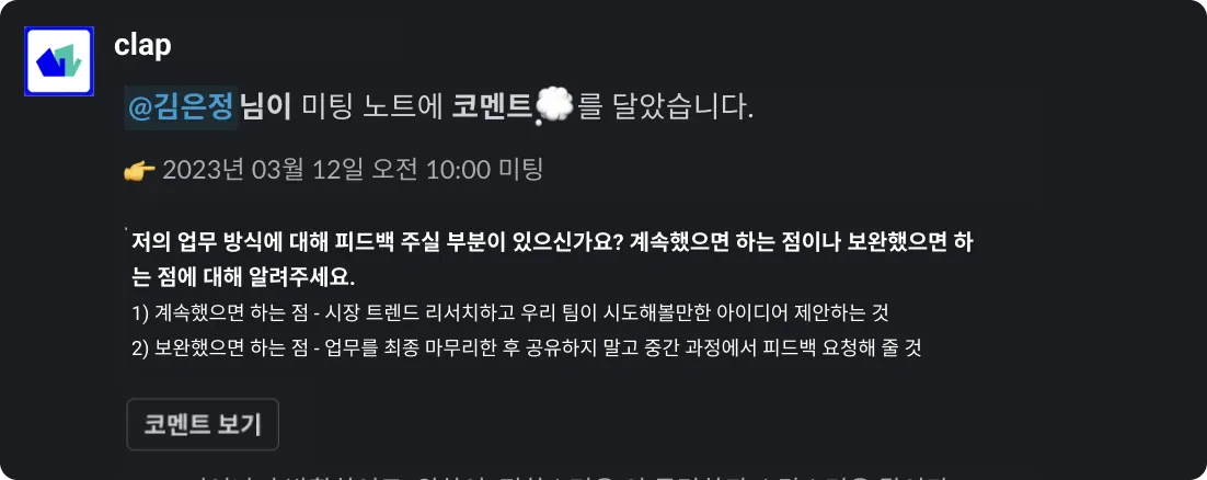 코멘트는 작성 시 미팅 상대방에게 슬랙 / 이메일 알림이 발송돼요.