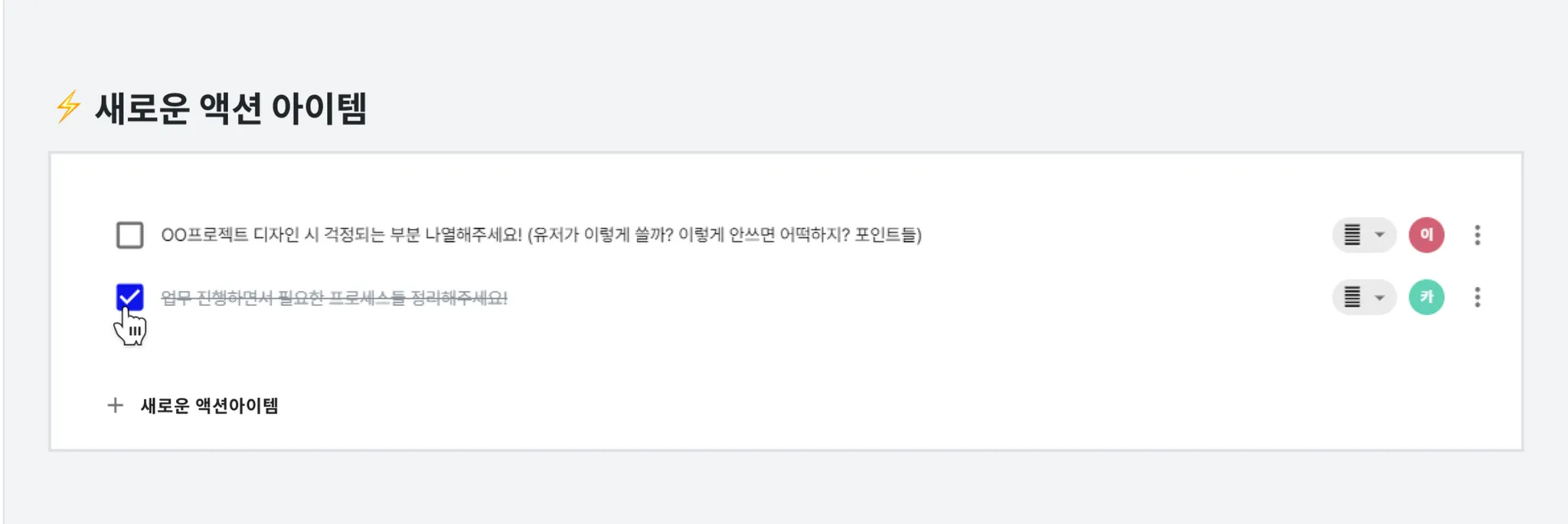 액션아이템을 실행했다면 체크박스를 눌러 완료로 처리해보세요.