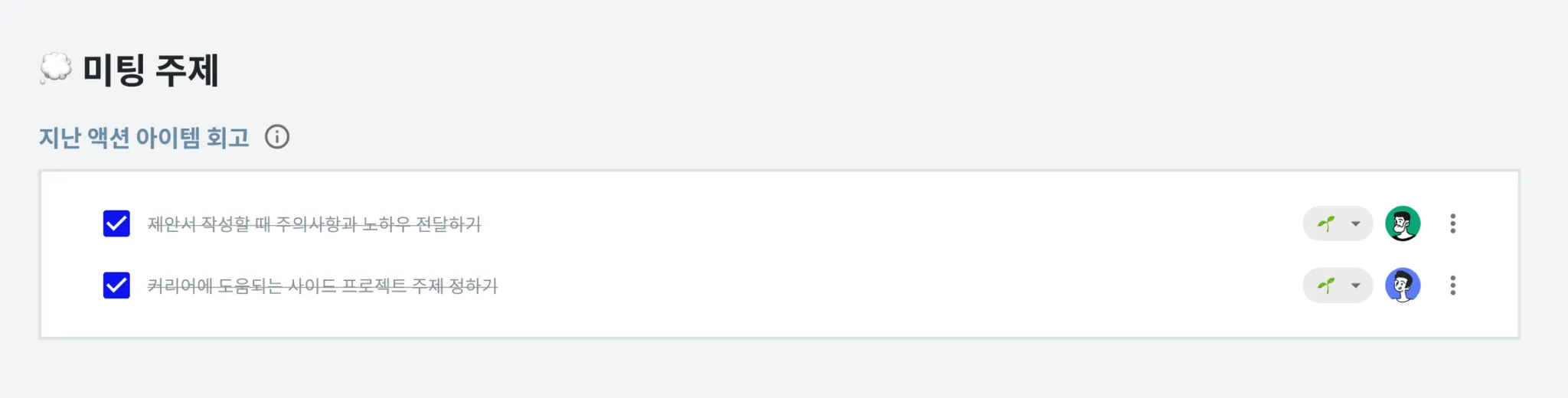 지난 미팅에서 액션아이템을 작성했다면 각 담당자가 잘 수행했는지 회고할 수 있어요.