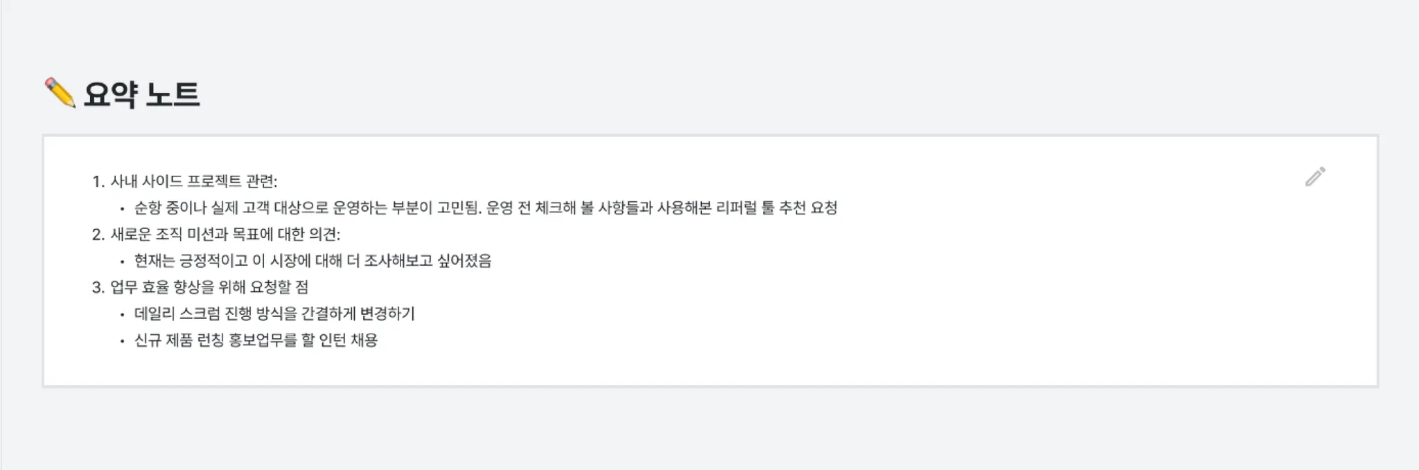 공유되는 내용: 액션 아이템 / 질문 목록 / 코멘트 / 요약노트