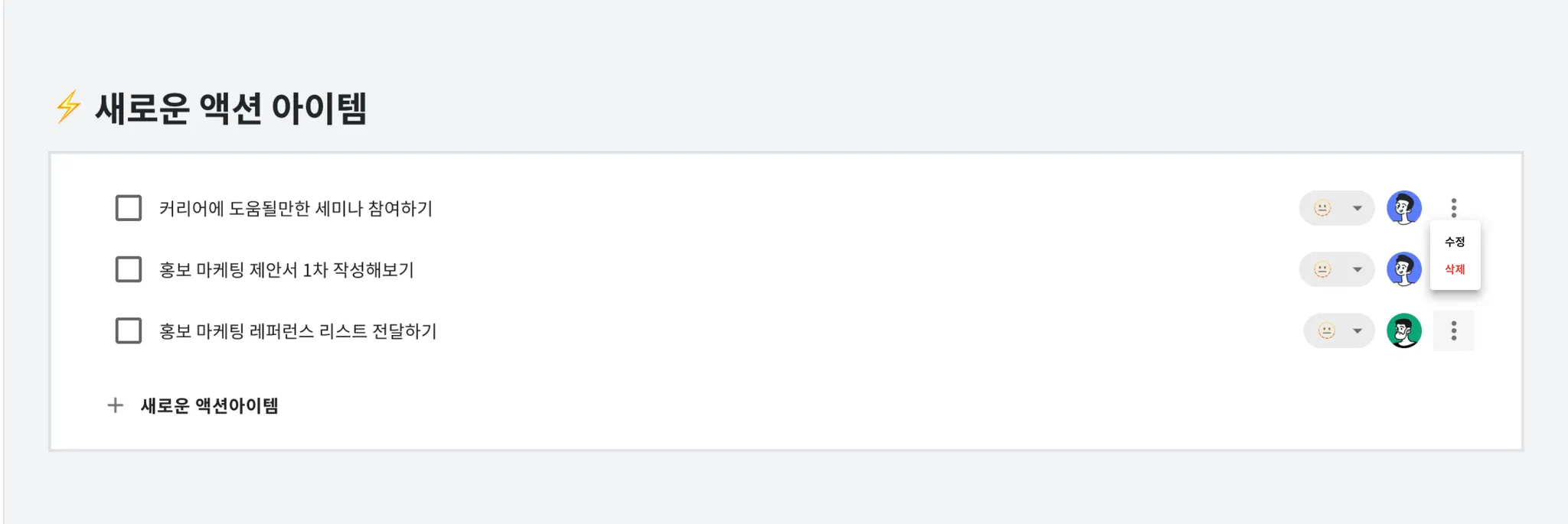 액션아이템 내용 수정은 더보기 (⋮) 를 눌러 수정 / 삭제할 수 있어요.