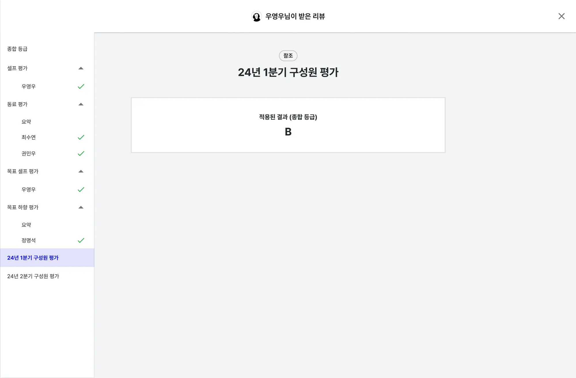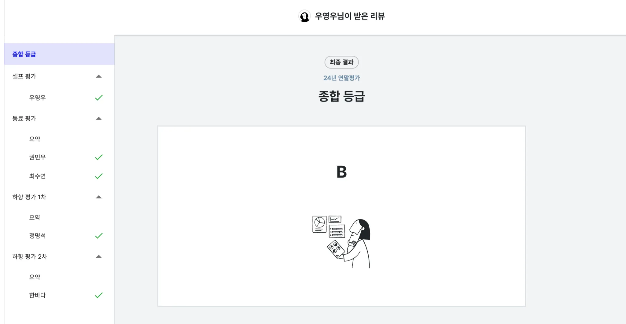 본인의 종합 등급 및 각 목표의 평가 내용에 대해 확인할 수 있어요. (결과 공개 시)