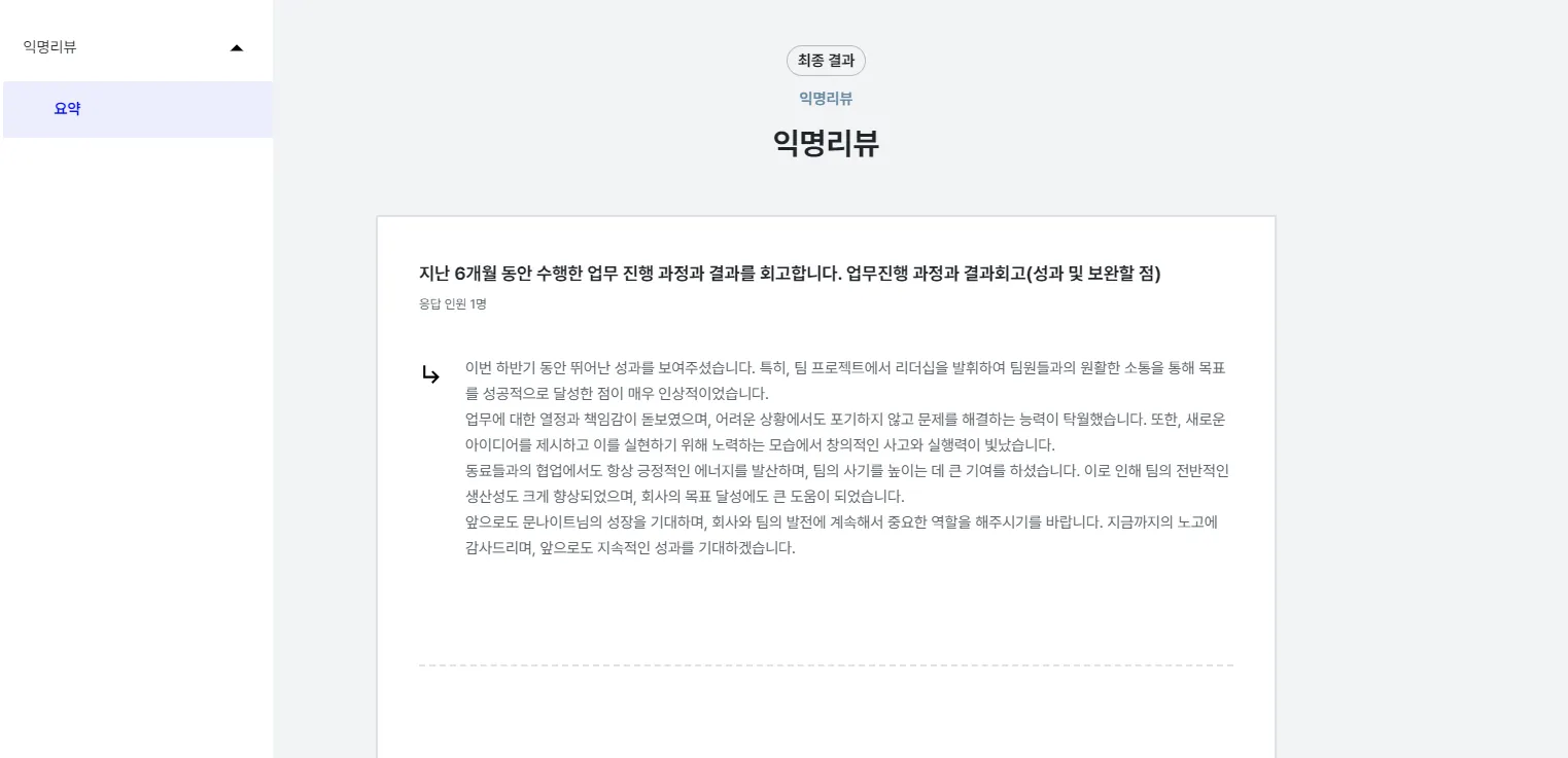 익명 리뷰는 작성자별 리뷰 결과는 확인할 수 없고, ‘요약’에서 전체 통계만 확인할 수 있어요.