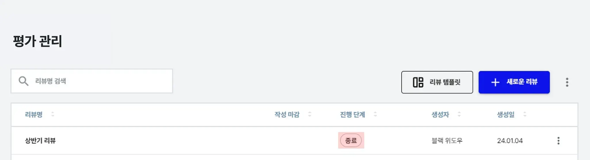 또는 평과 관리 > 진행 단계: 종료 항목을 클릭해서 리뷰 결과를 확인할 수 있어요