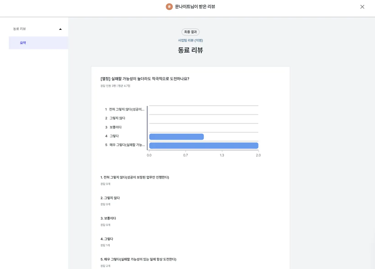 또는 나의 평가 > 받은 리뷰 > 리뷰명 을 클릭해서 리뷰 결과를 확인할 수 있어요