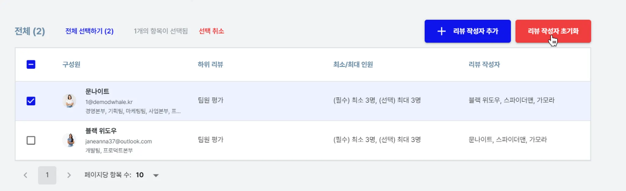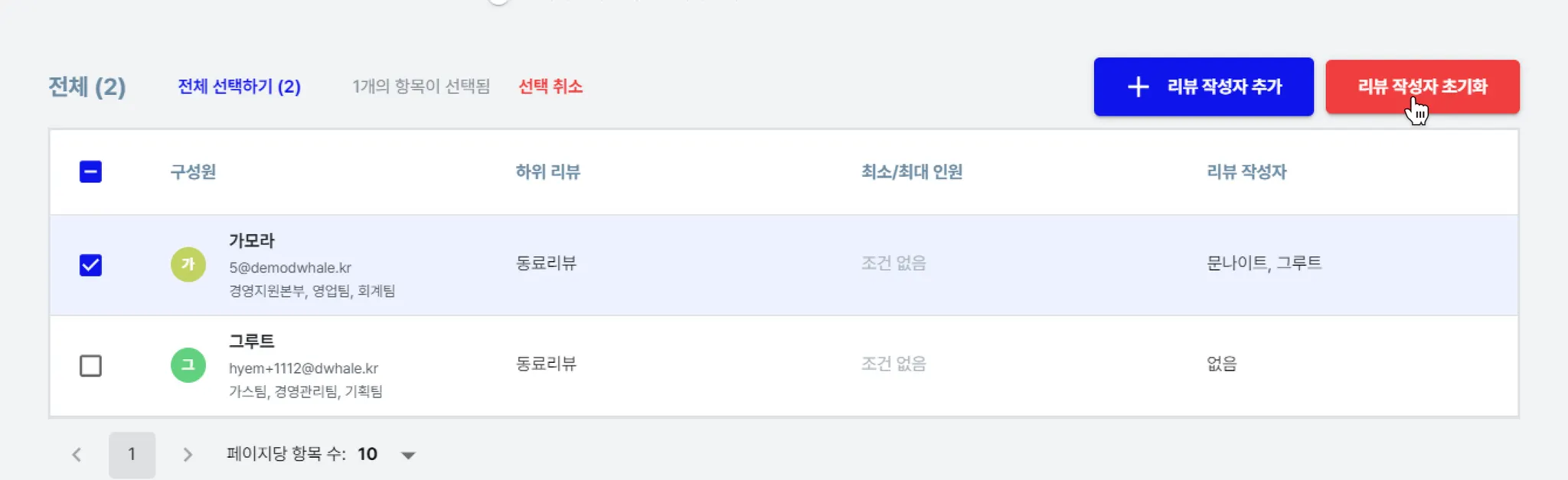 설정한 작성자를 모두 삭제 후 다시 설정하려면 해당 구성원 이름 좌측 ‘체크박스’를 선택 후 [리뷰 작성자 초기화] 버튼을 누릅니다.