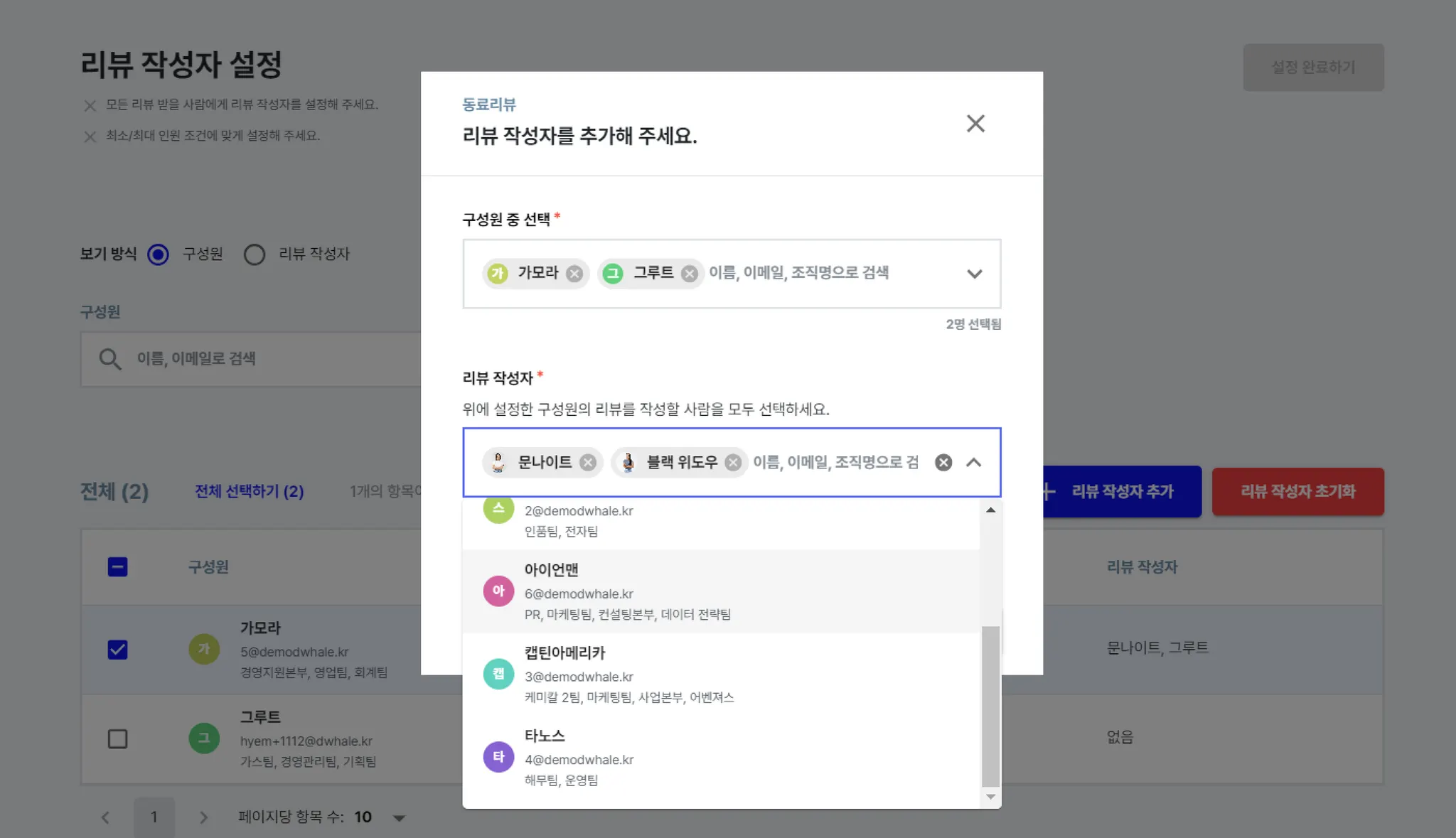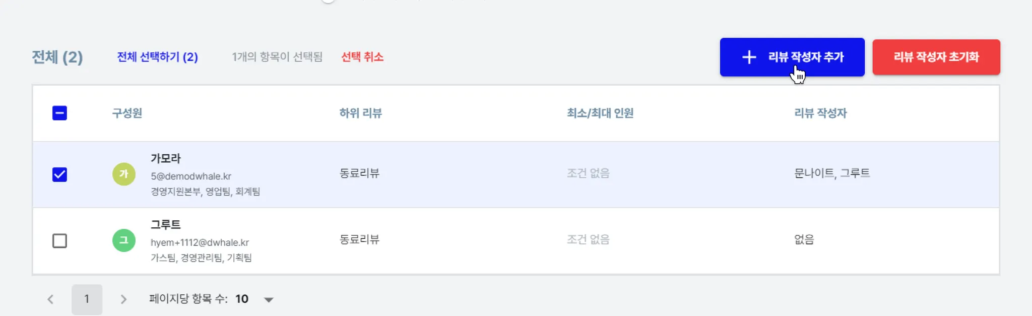 여러 명에게 동일한 리뷰 작성자를 추가하려면 해당 구성원들의 ‘체크박스’를 선택 후 [ + 리뷰 작성자 추가]를 눌러주세요.