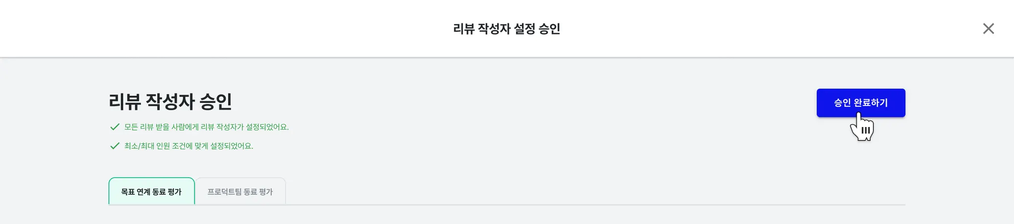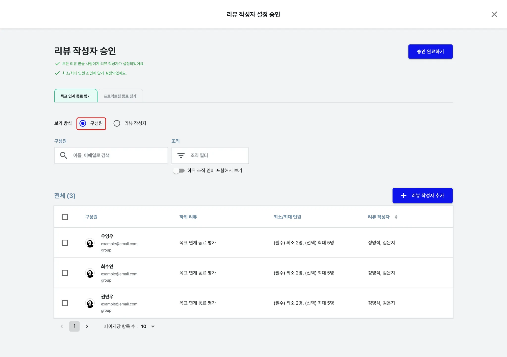 작성자 승인 화면에 입장하면 작성자(평가자)가 지정된 구성원 명단을 확인할 수 있어요.