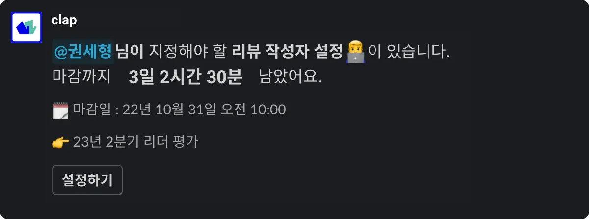 작성자 설정 기간이 시작되면, 작성자 설정을 진행해 달라는 알림을(이메일&슬랙) 받게 돼요.