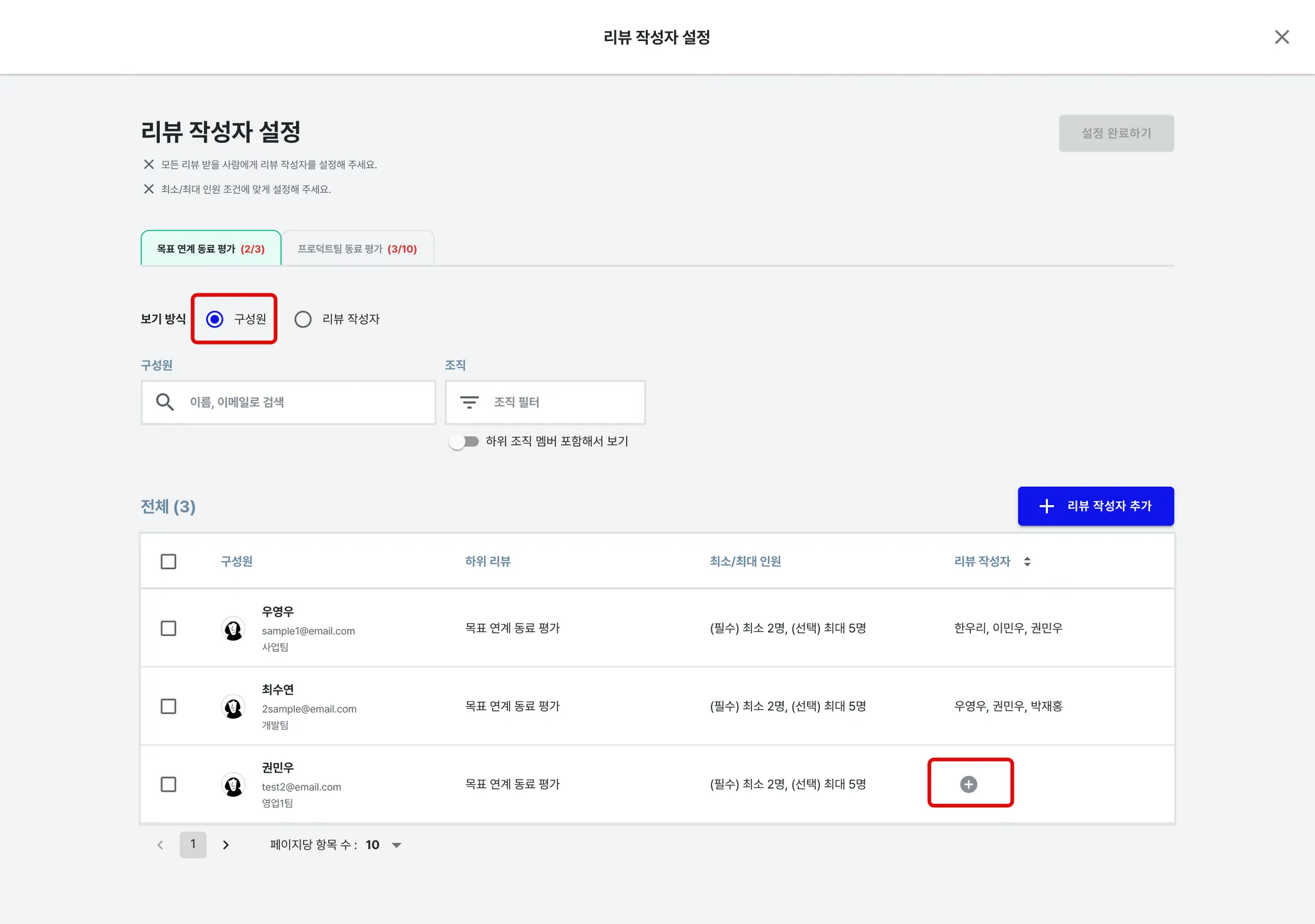 리뷰 작성자 열의 [+] 버튼 또는 [+리뷰 작성자 추가]를 눌러 구성원별 작성자를 지정합니다.
