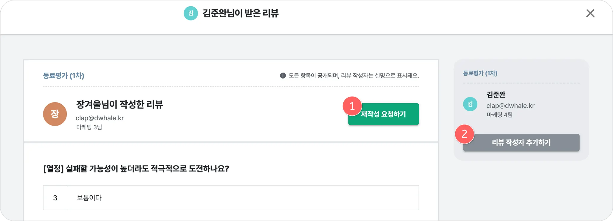 관리자의 설정에 따라, 이전 차수 리뷰 화면에서 ‘재작성 요청하기’ 또는 ‘리뷰 작성자 추가하기’ 버튼이 표시됩니다.
