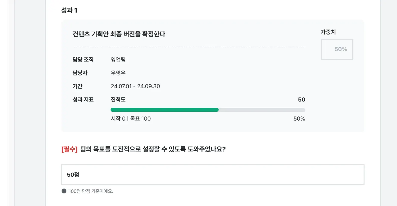 ex) 목표의 진척도가 50%이면 50점이 자동 입력되어 있습니다