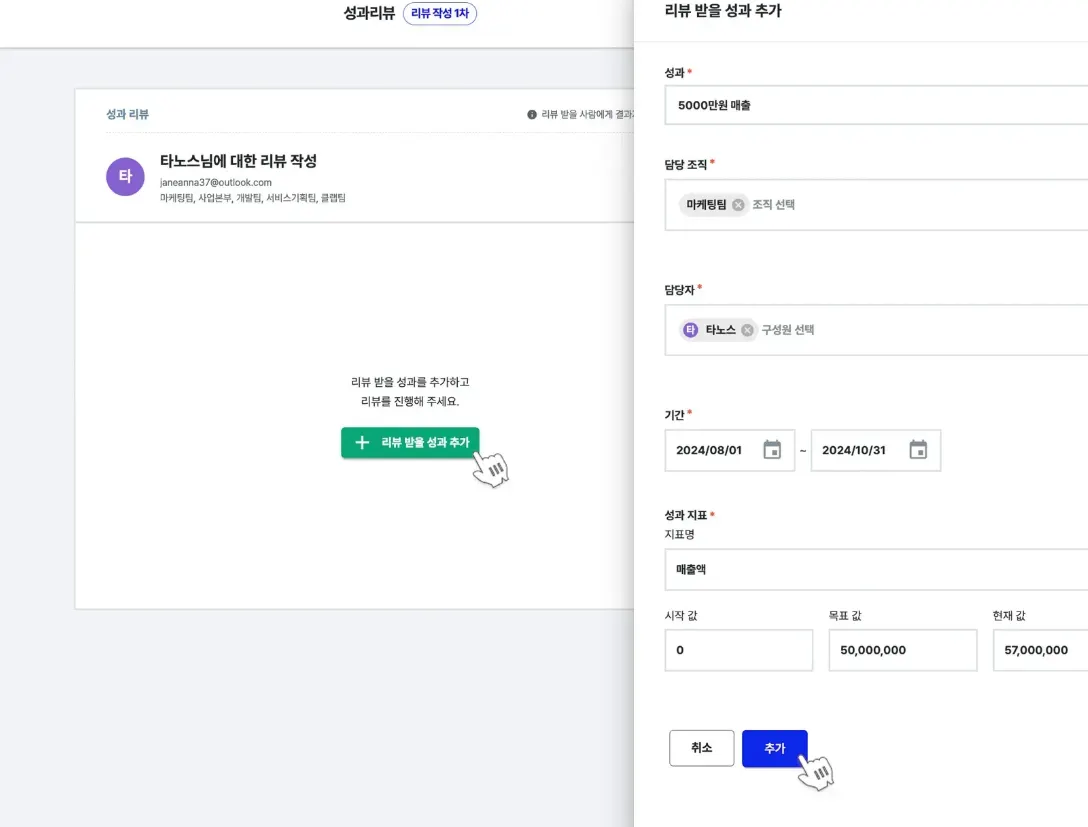 [ + 리뷰 받을 성과 추가 ] 버튼을 누르면 화면 오른쪽에 목표 입력 양식이 나옵니다.