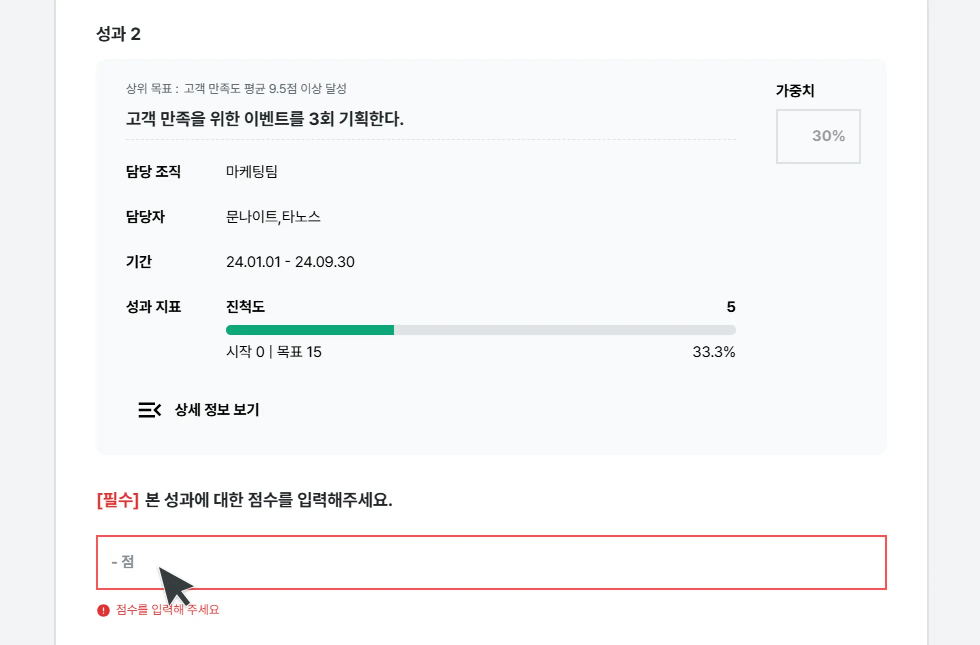 성과 진척률 기반 점수 입력 옵션이 활성화 되어있다면 성과에 대한 진척도 기반으로 점수가 자동으로 입력됩니다.