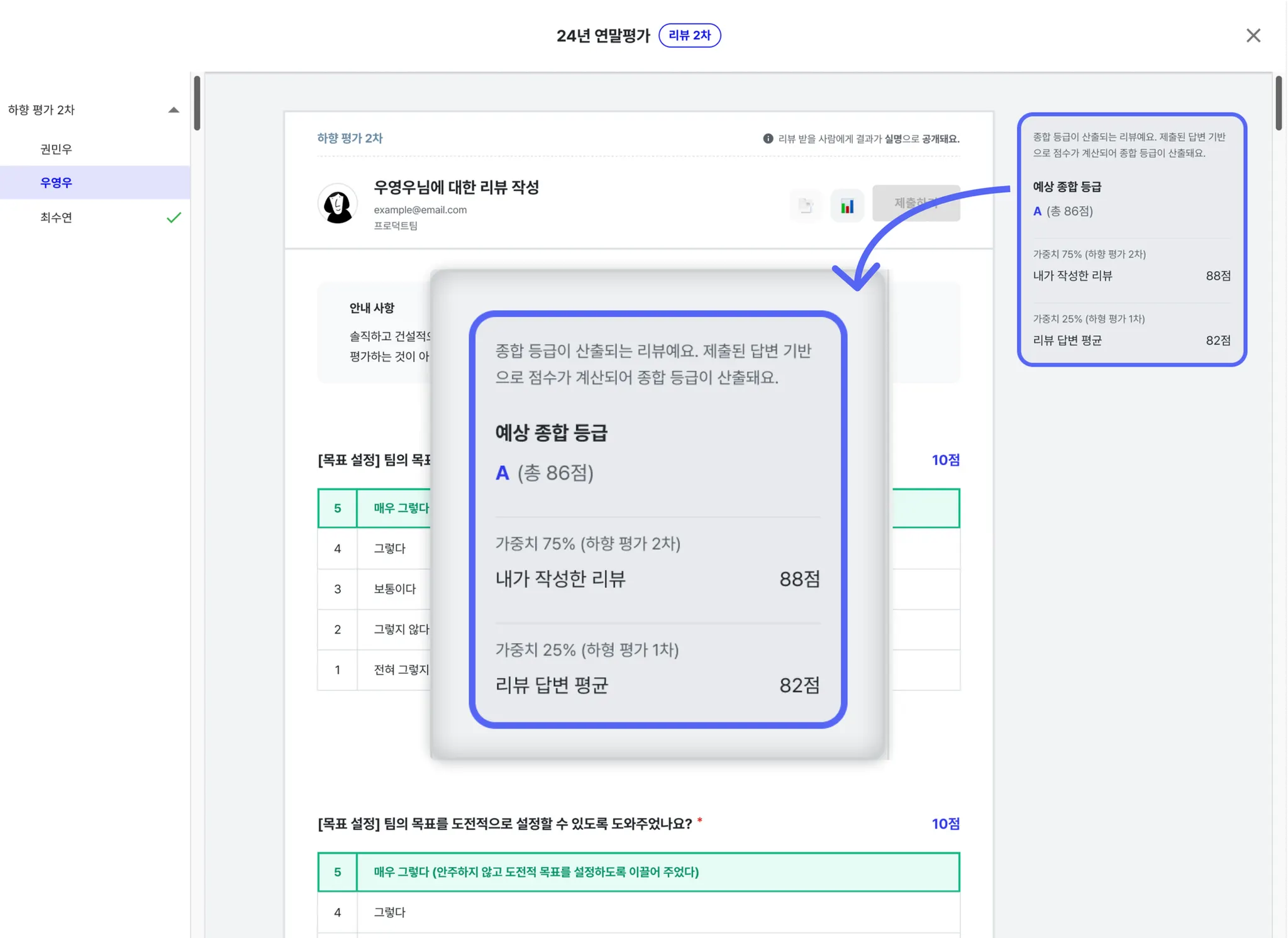 예상 종합 등급: 현재까지 제출된 결과를 기반으로 리뷰 받을 사람(피평가자)의 예상 종합 등급을 보여줍니다