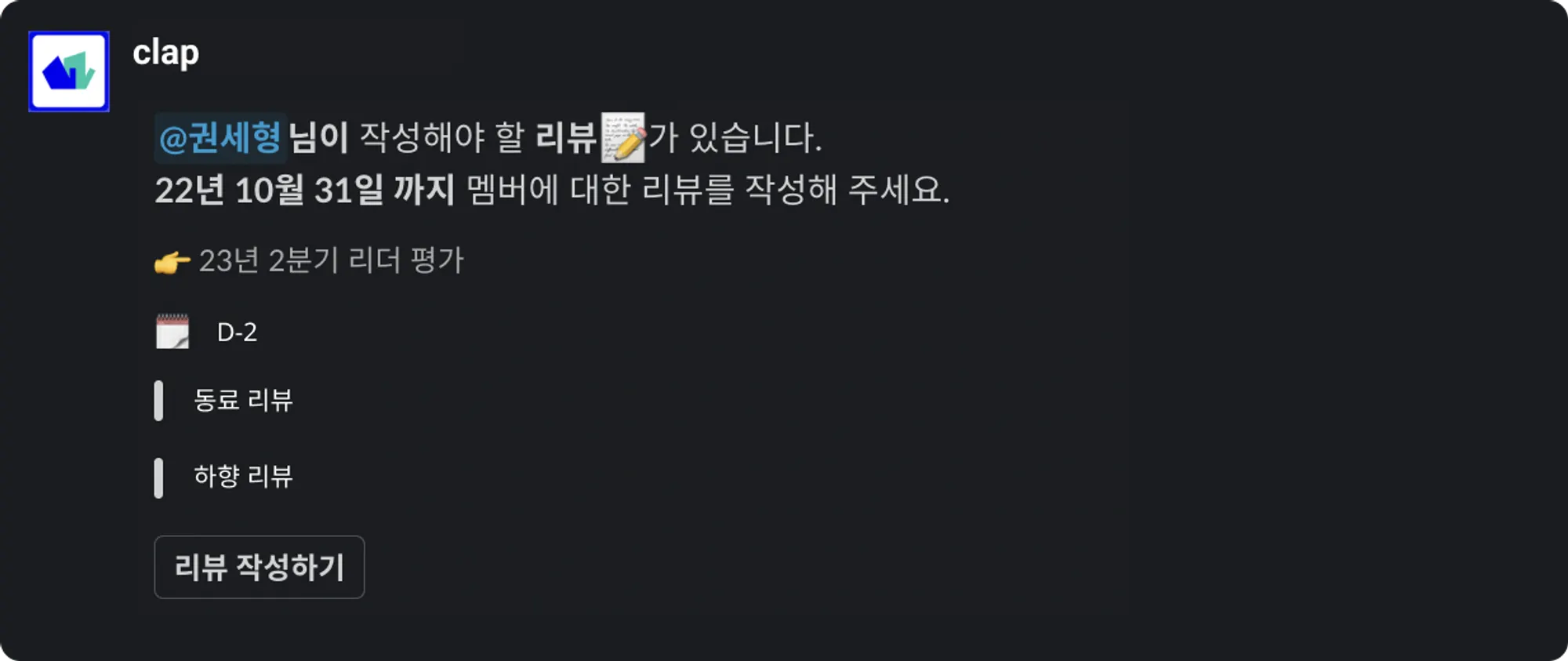 리뷰 작성 기간이 시작되면, 리뷰를 작성해 달라는 알림을(이메일&슬랙) 받게 돼요.
