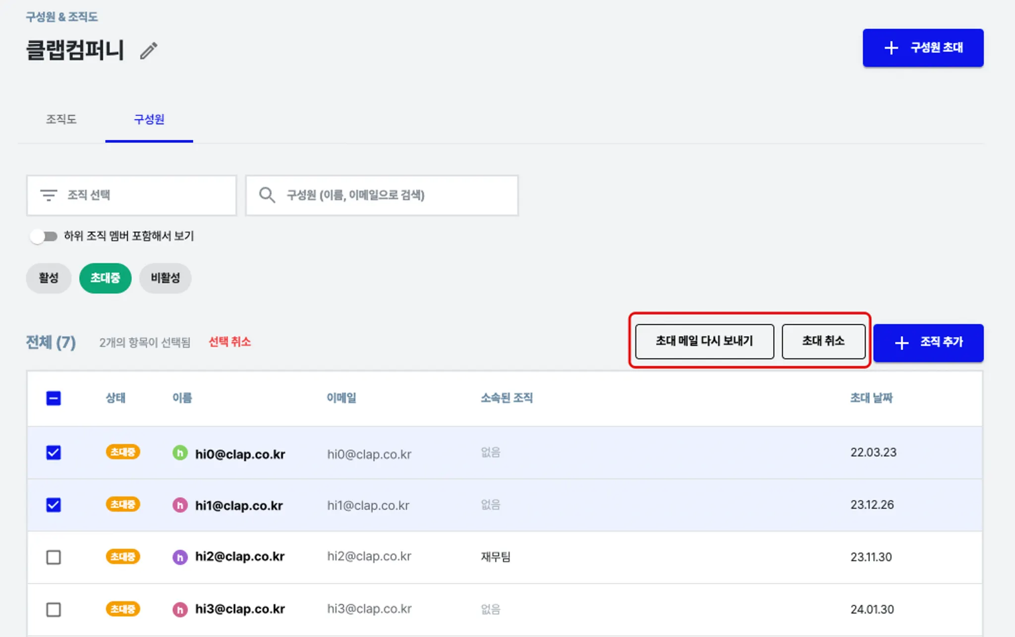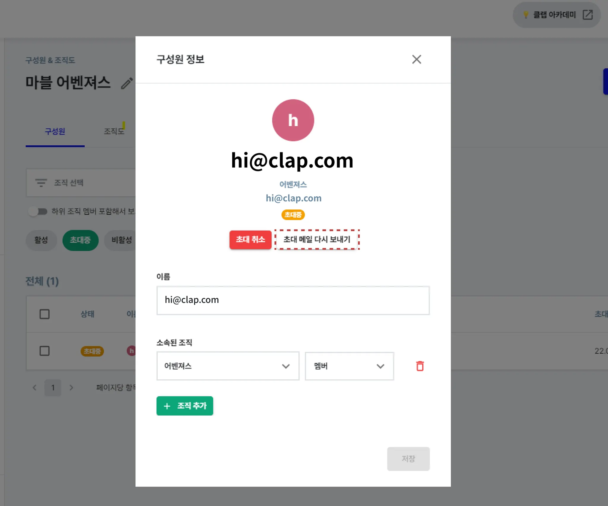 [초대 취소] 와 [초대 메일 다시 보내기] 버튼은 [구성원 이름 클릭 > 구성원 정보] 화면에도 있습니다.