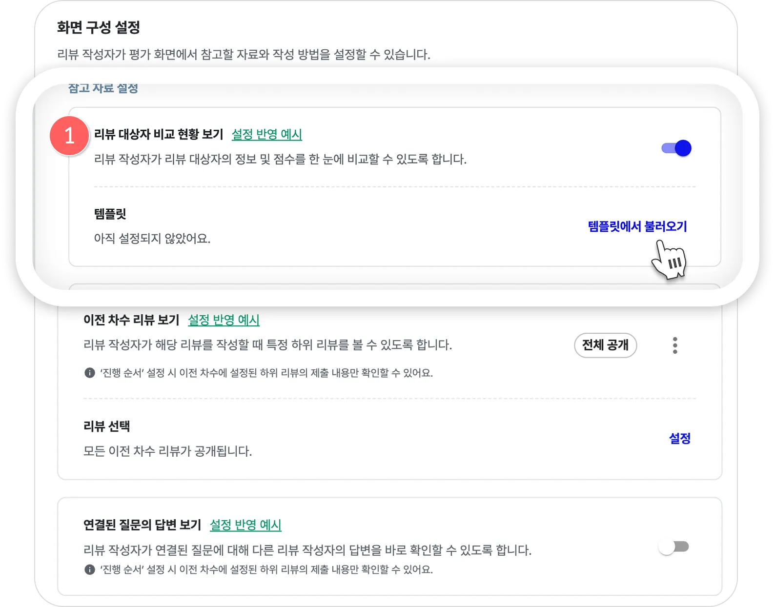 (1) [리뷰 대상자 비교현황 보기] 옵션을 ‘사용’ 상태(오른쪽)로 변경합니다.