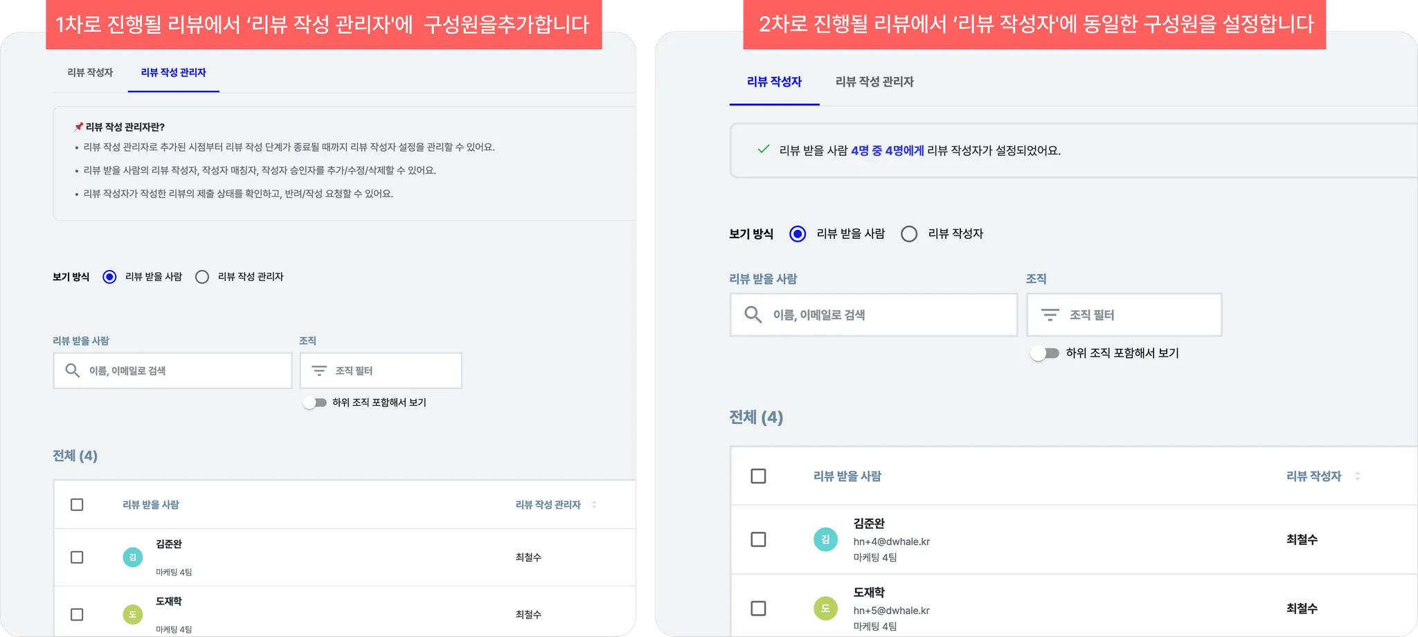 리뷰 받을 사람 설정 : 각 그룹에 포함시킬 피평가자를 지정합니다.