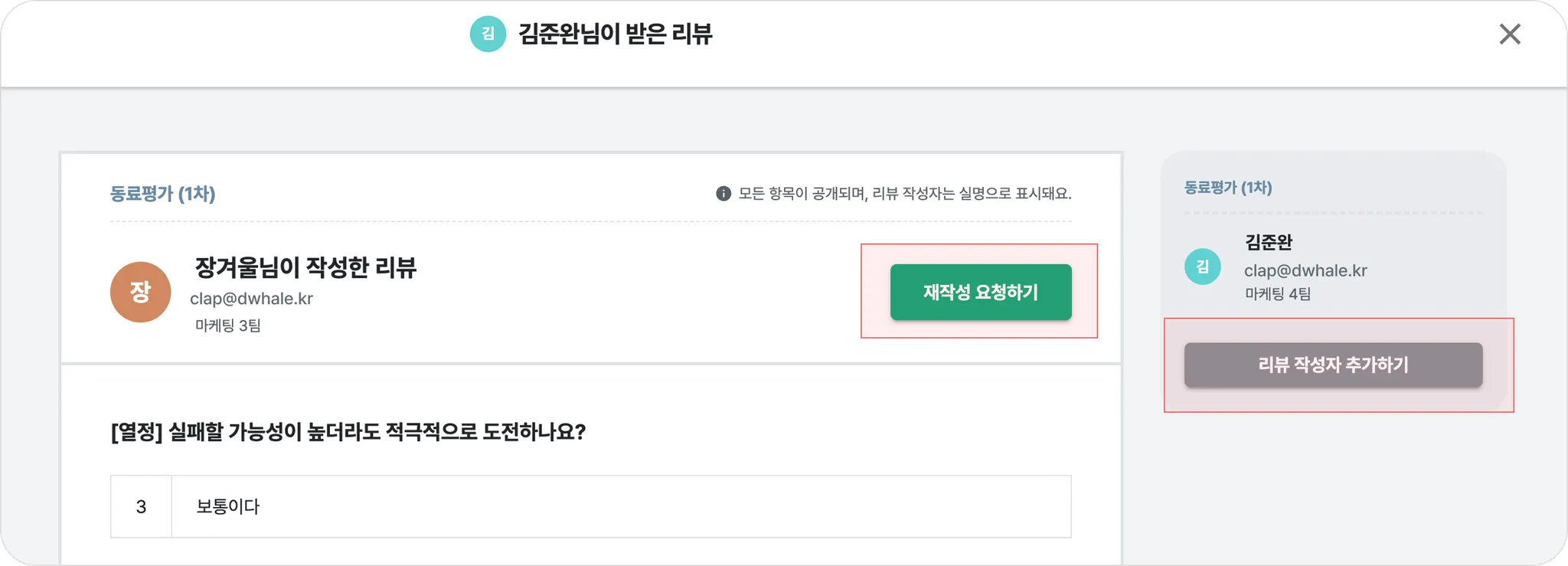 바로 재작성 요청하기 , 리뷰 작성자 추가하기 버튼을 사용할 수 있습니다.