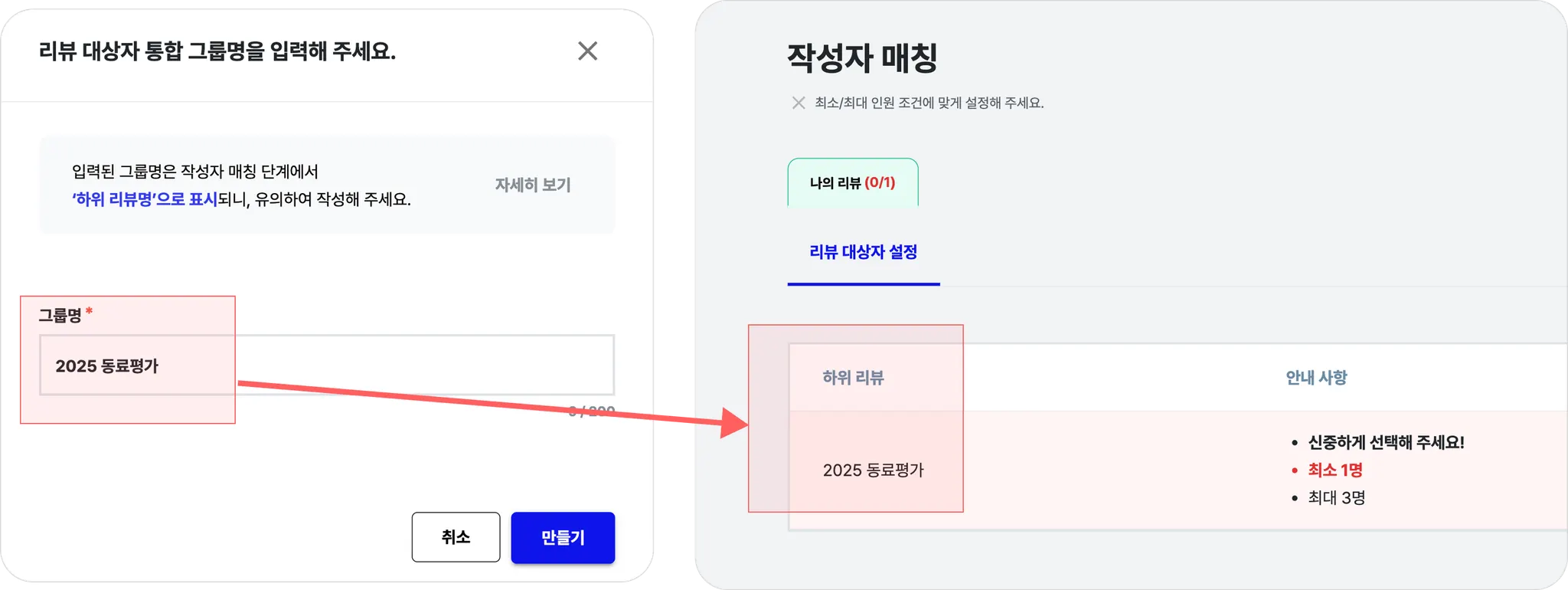 (3) 리뷰 받을 사람 설정: 해당 그룹에서 조정할 피평가자를 지정합니다.