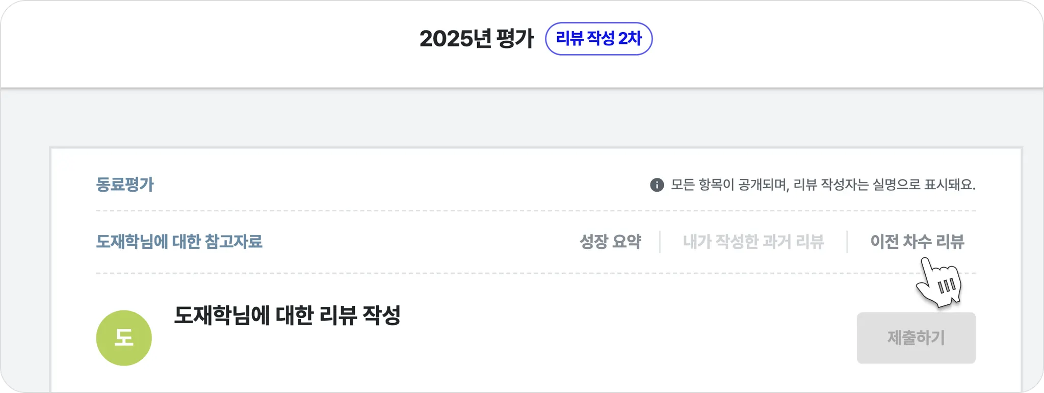 리뷰 작성자가 피평가자의 이전 차수 리뷰(참고자료) 화면에서