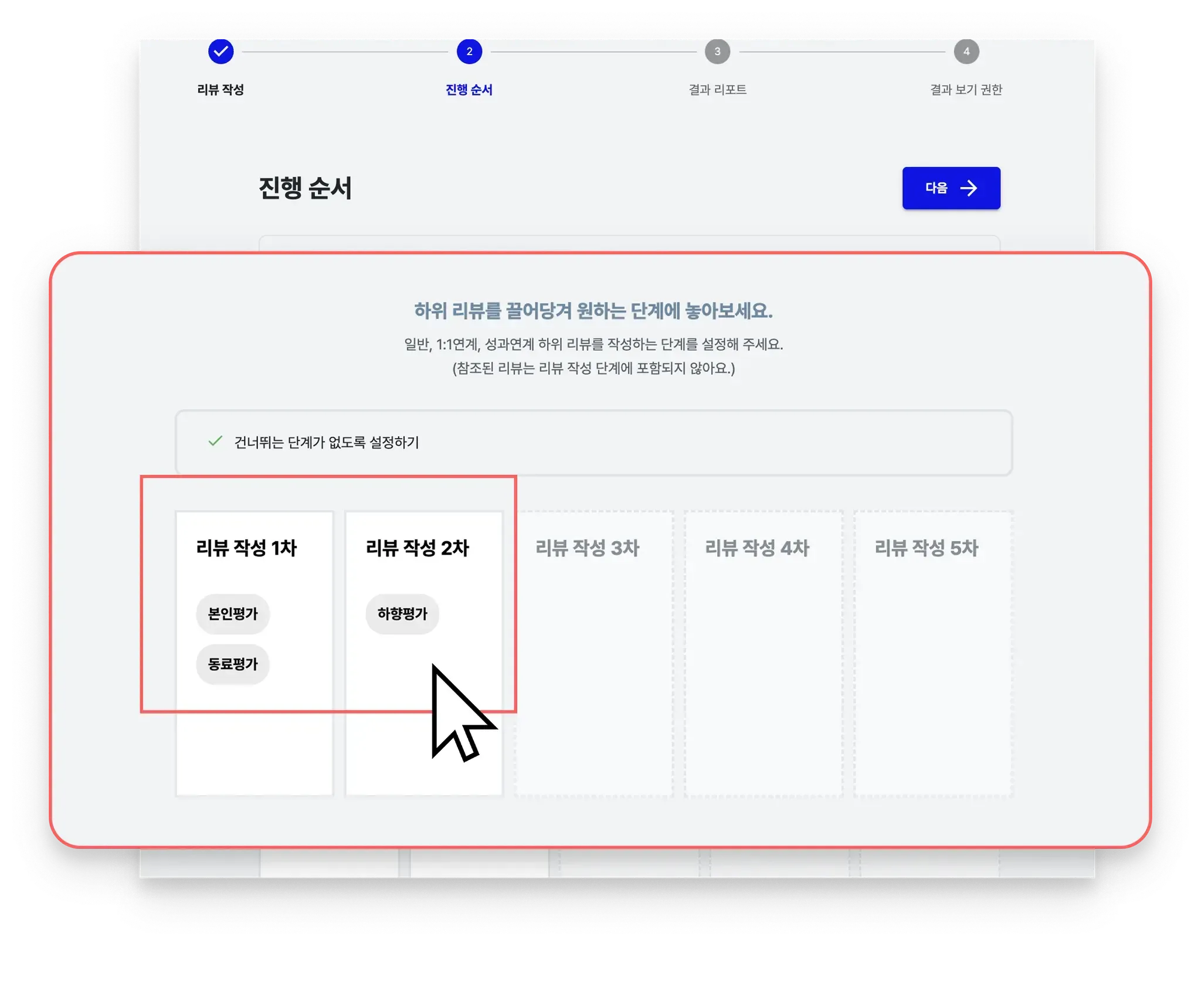 차수 지정은 하위 리뷰 이름을 마우스로 끌어서 진행할 차수 상자로 넣어 주세요.