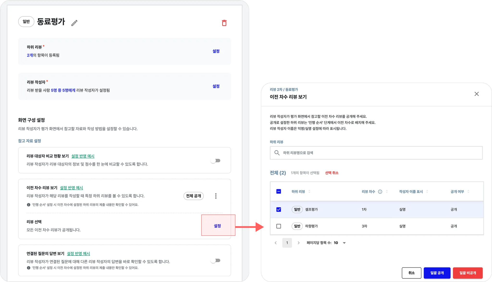 설정 대상의 ‘리뷰 대상자’: 피평가자가 직접 평가할 대상을 선택하는 옵션