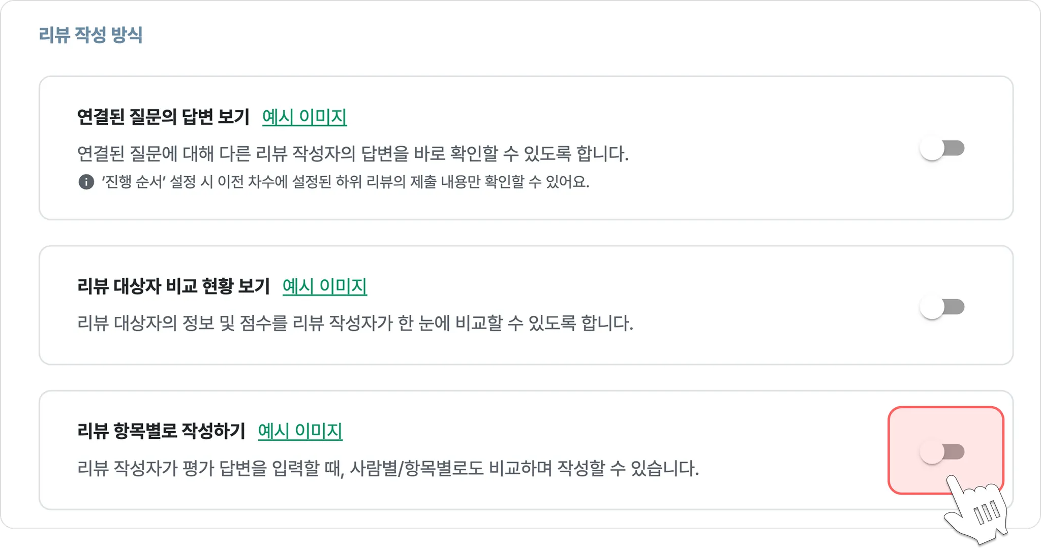 옵션을 켜면, 리뷰 참여자는 [사람별]과 [항목별] 두 가지 방식으로 리뷰를 작성할 수 있습니다.